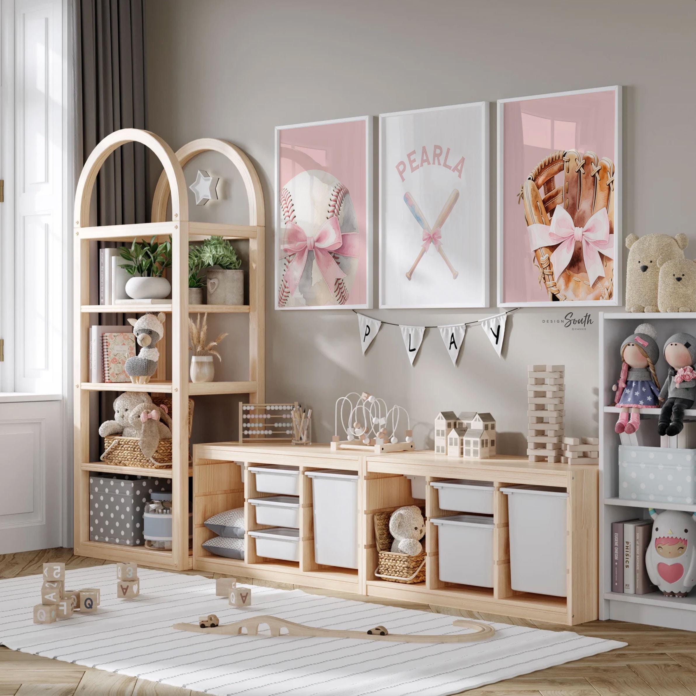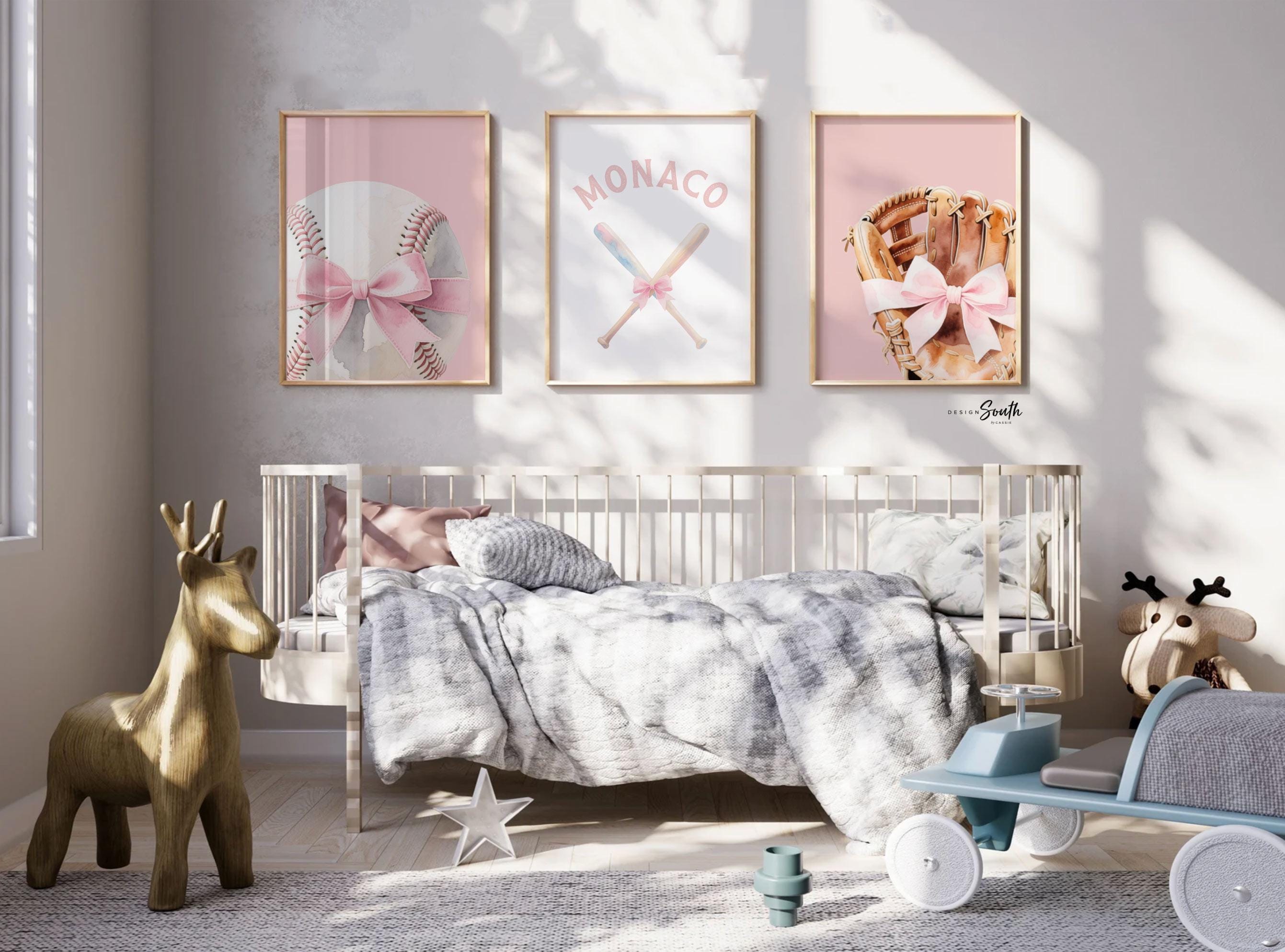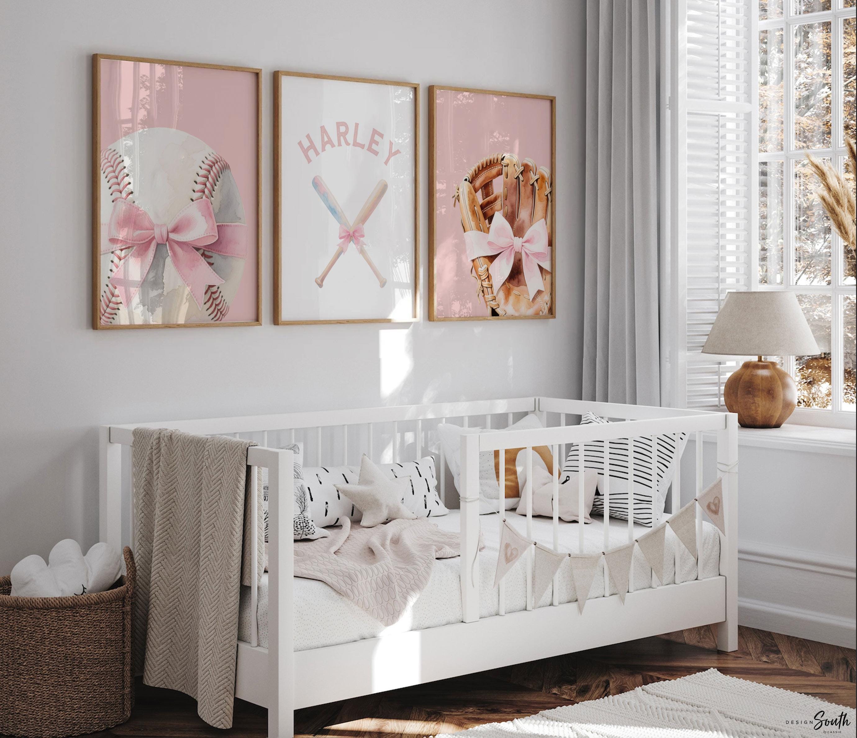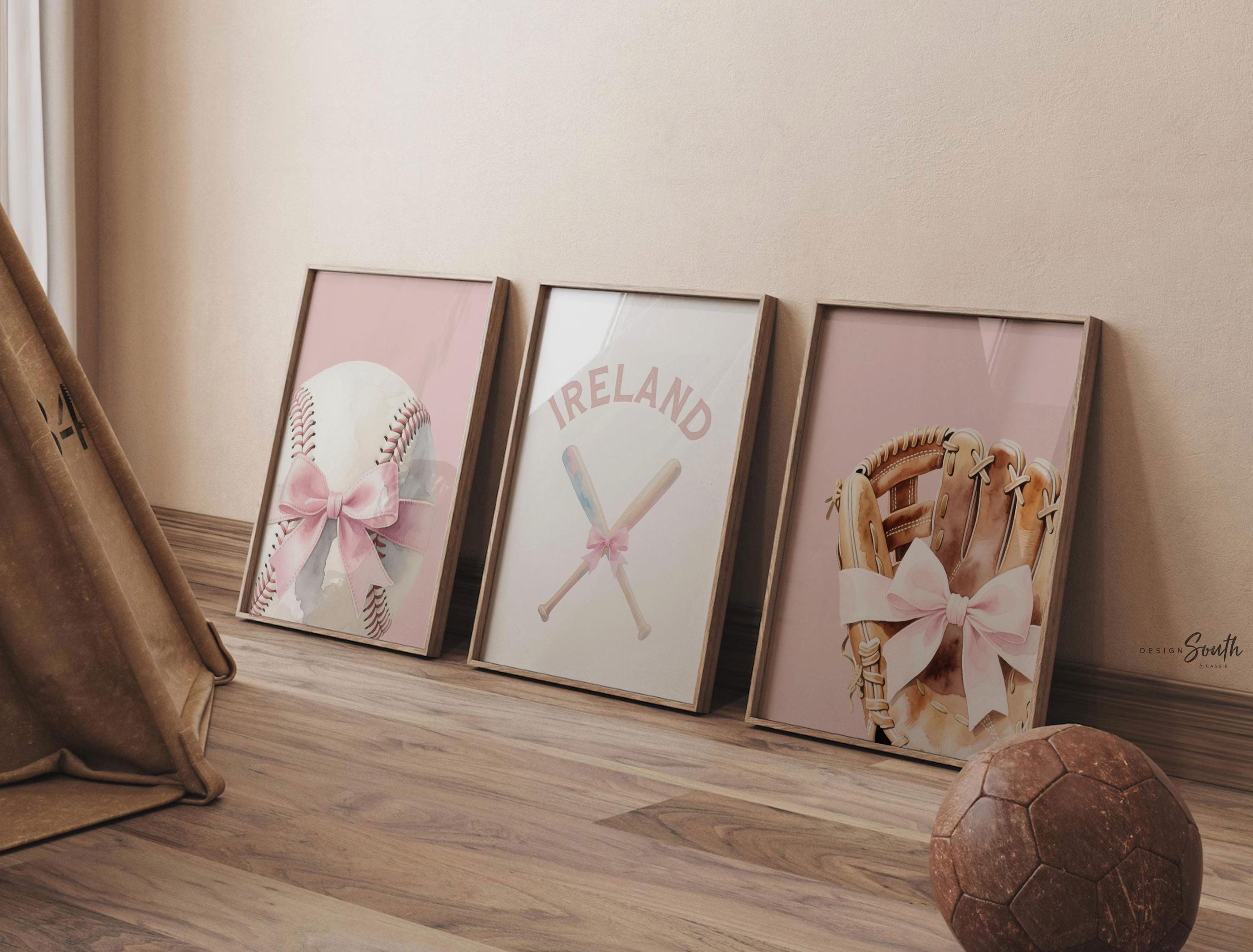 Product description: Softball theme watercolor prints in a soft pink shade including a softball, glove and bat accented with bows, and matching personalized print to be customized with your child's name. Other options are also available in my shop.