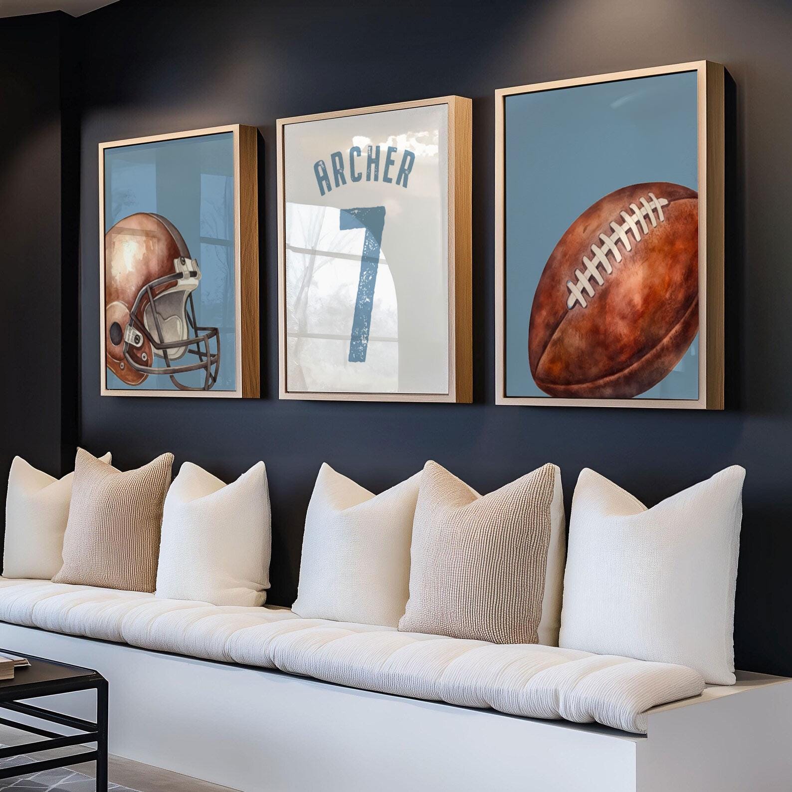 Product description: Football theme watercolor prints including a football, helmet and matching personalized print to be customized with your child's name and number. Other options are also available in my shop.