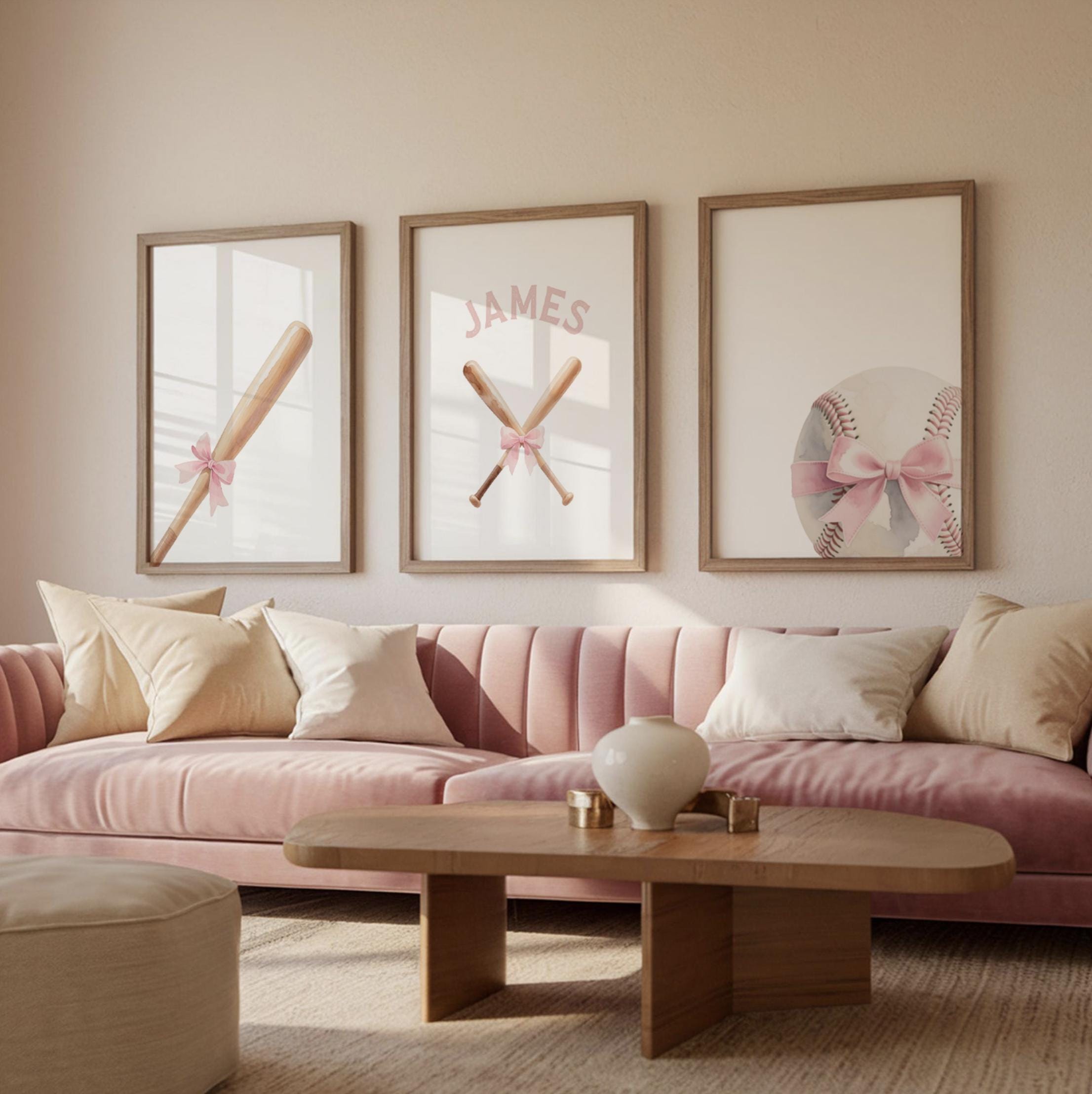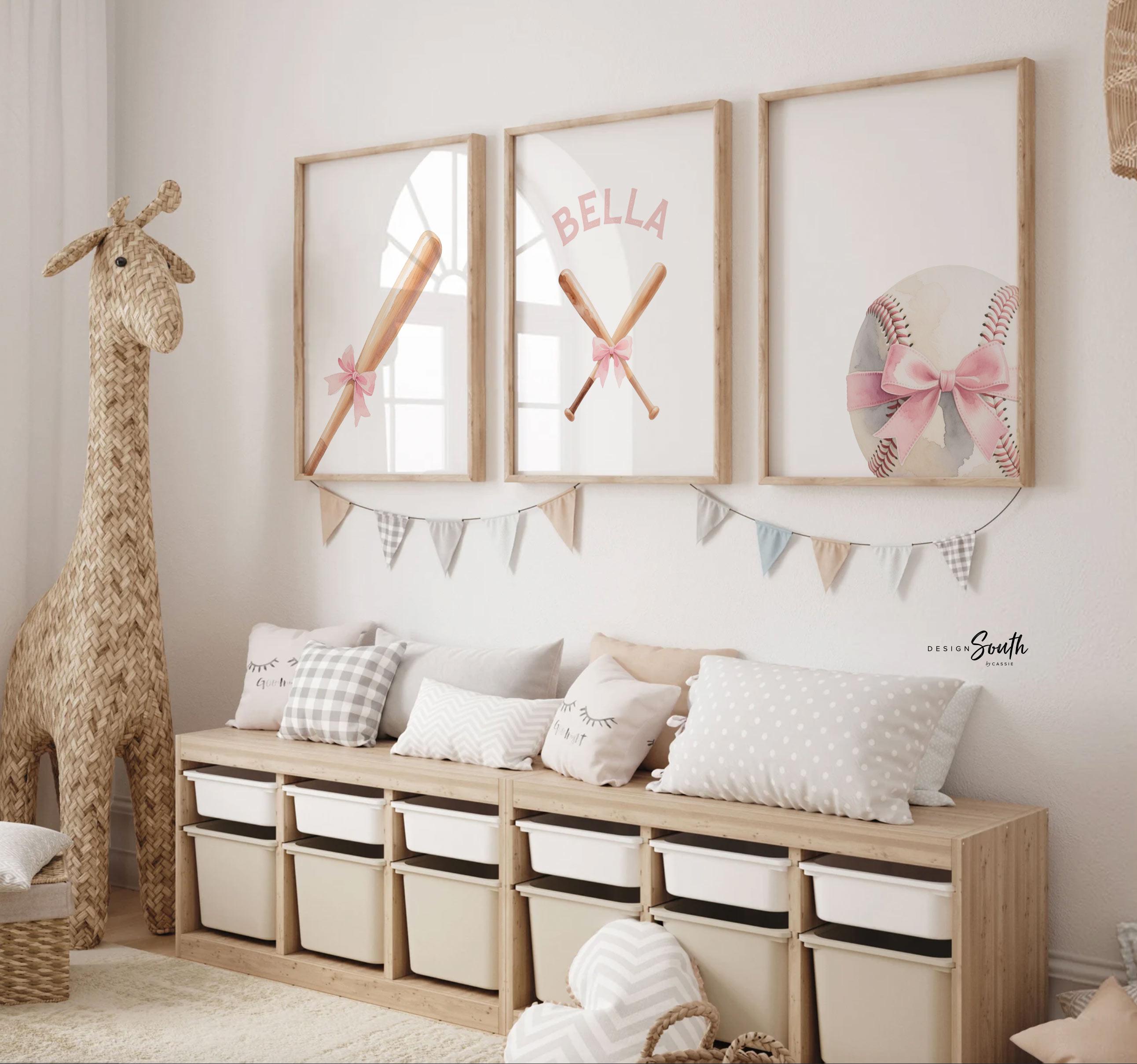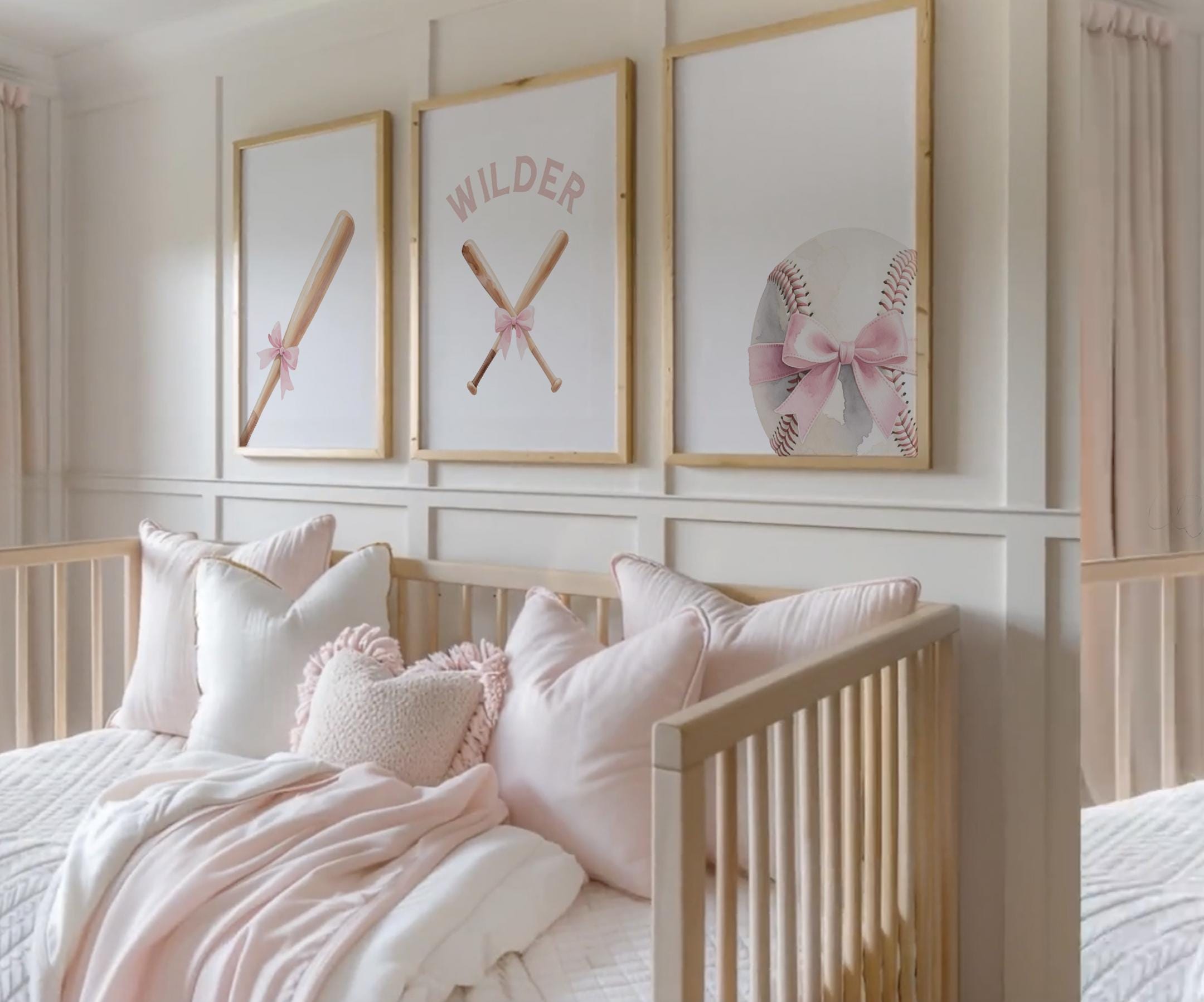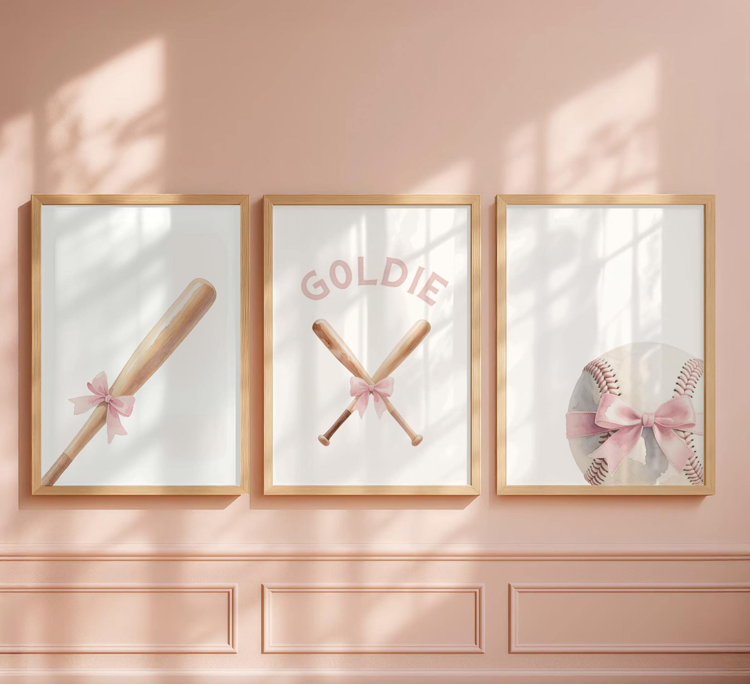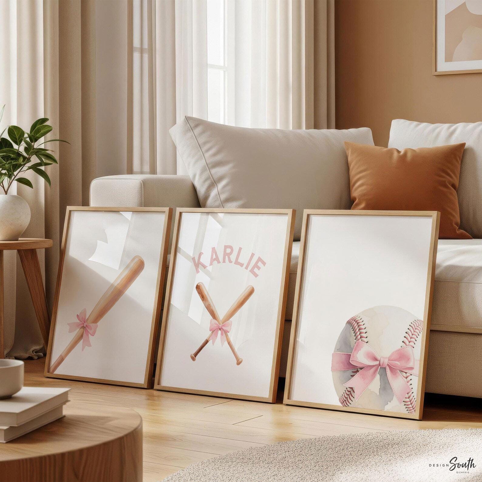 Product description: Softball theme watercolor prints in a soft pink shade including a softball and baseball bat accented with bows, and matching personalized print to be customized with your child's name. Other options are also available in my shop.