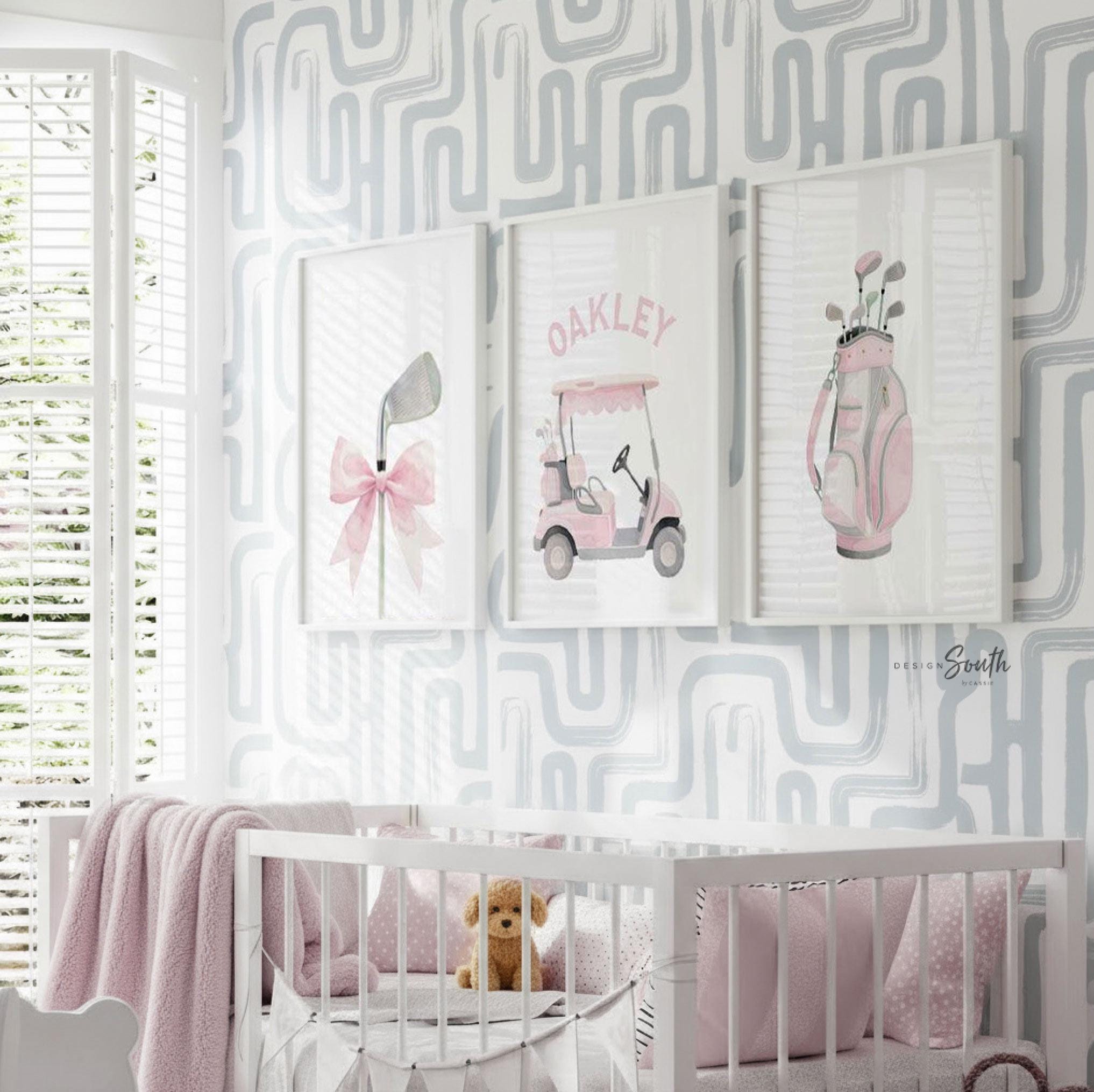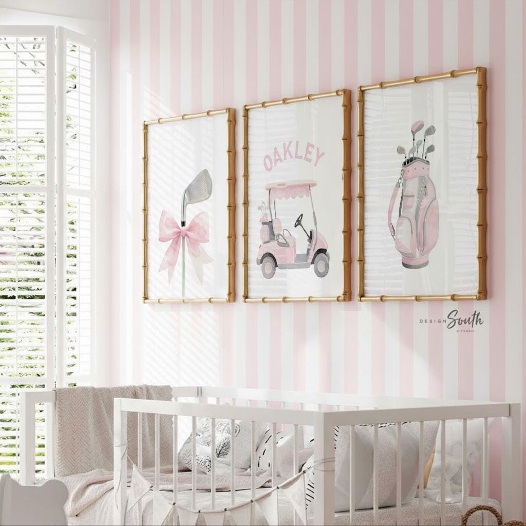 Product description: Original golf theme watercolor prints in shades of pink and gray including a golf club accented with a bow, a golf cart with matching personalized print to be customized with your child's name, and a chic detailed golf bag with clubs. Other options are also available in my shop.