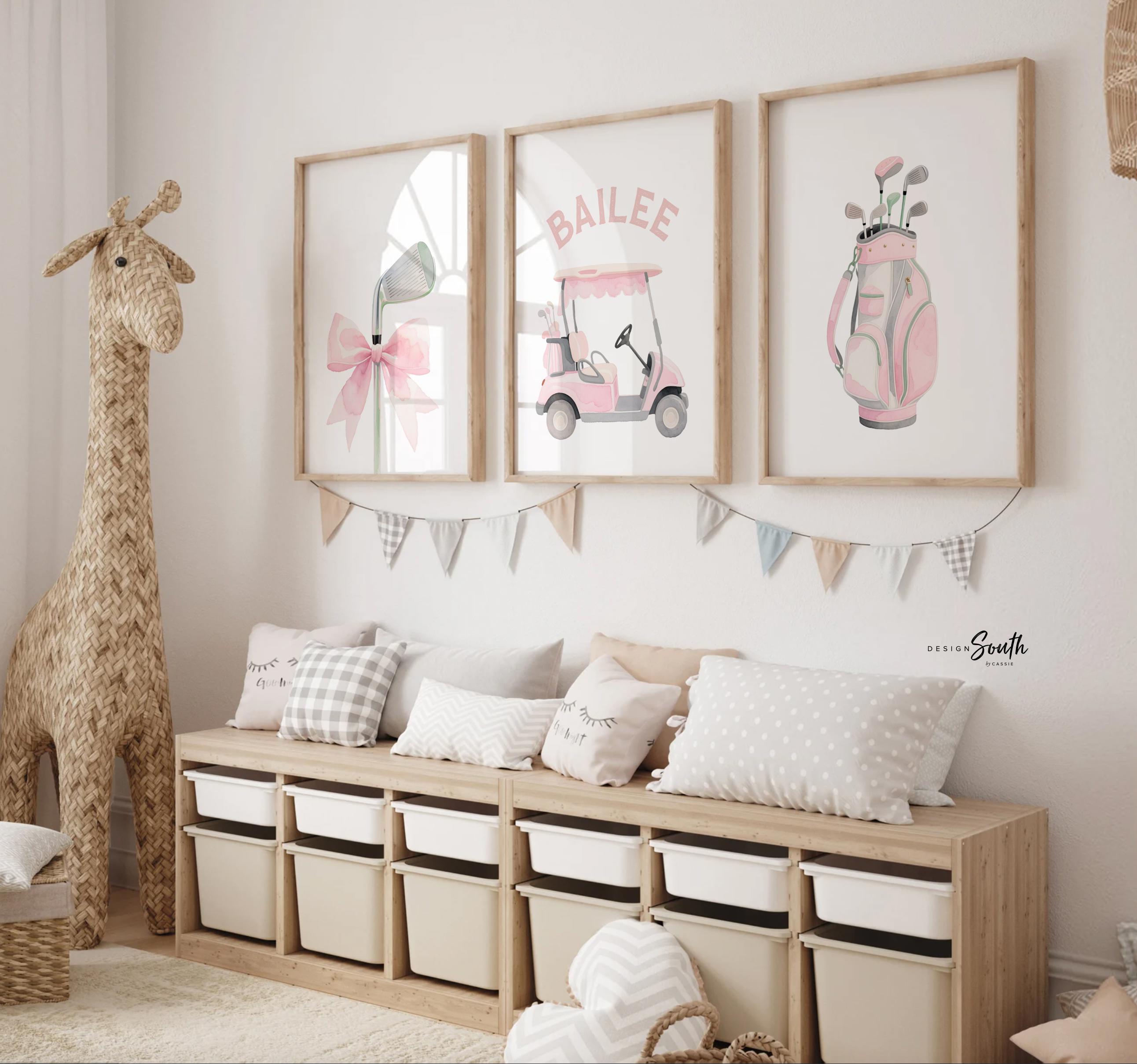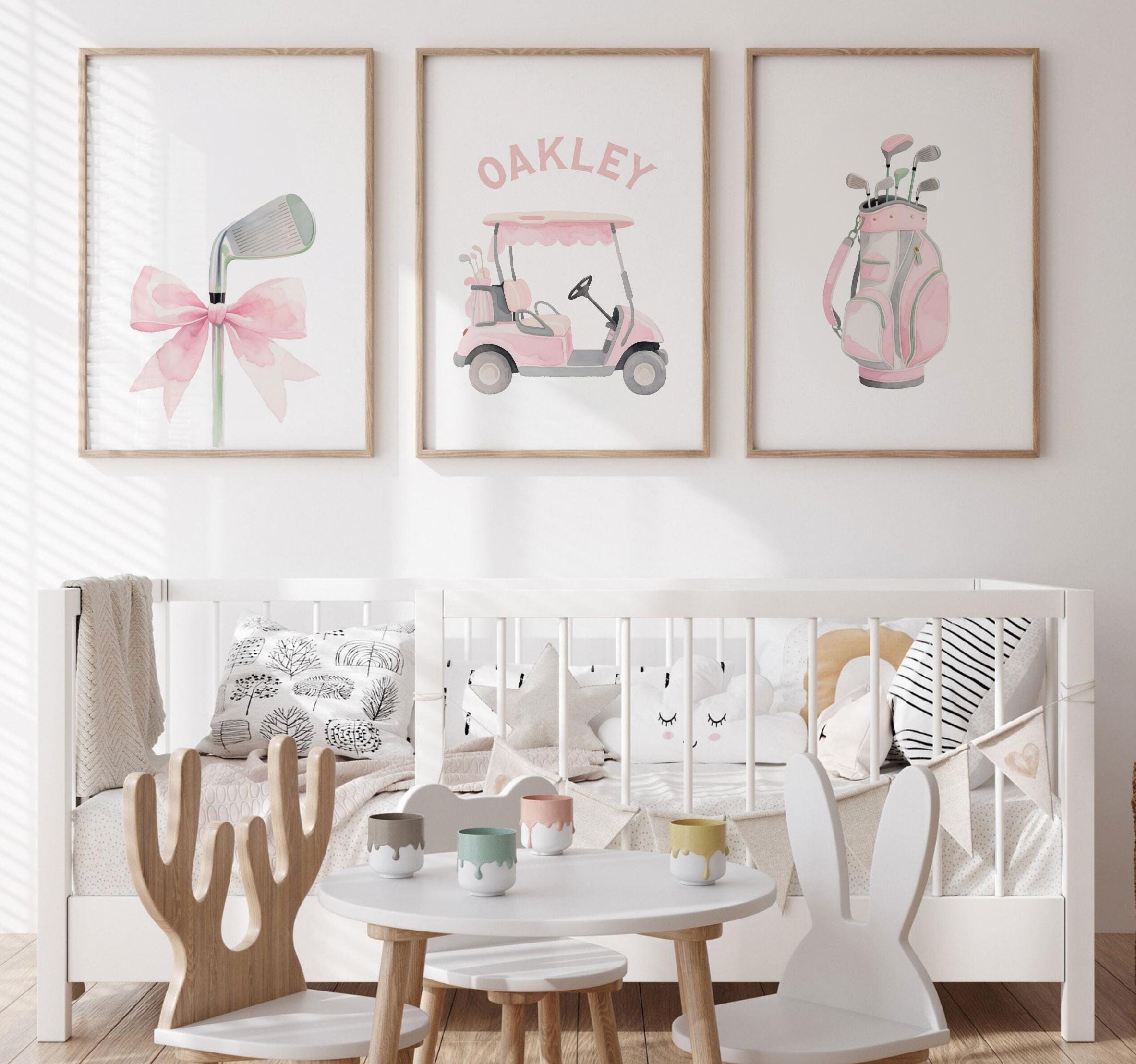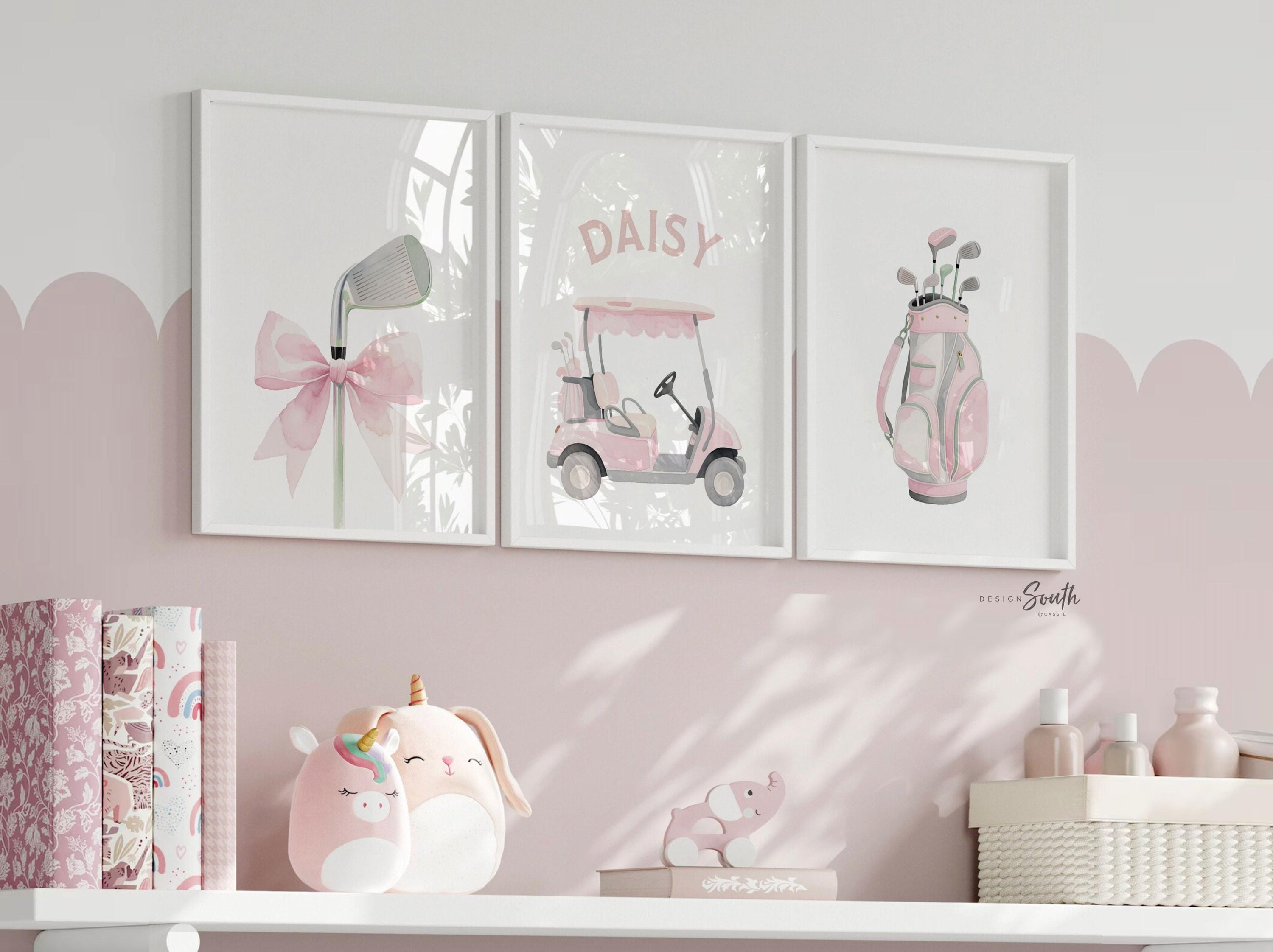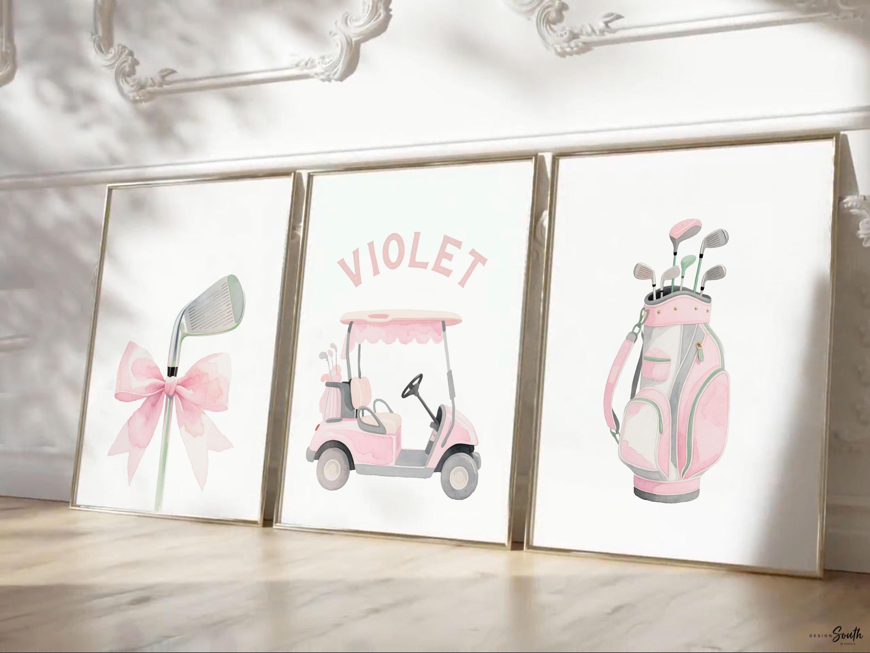 Product description: Original golf theme watercolor prints in shades of pink and gray including a golf club accented with a bow, a golf cart with matching personalized print to be customized with your child's name, and a chic detailed golf bag with clubs. Other options are also available in my shop.