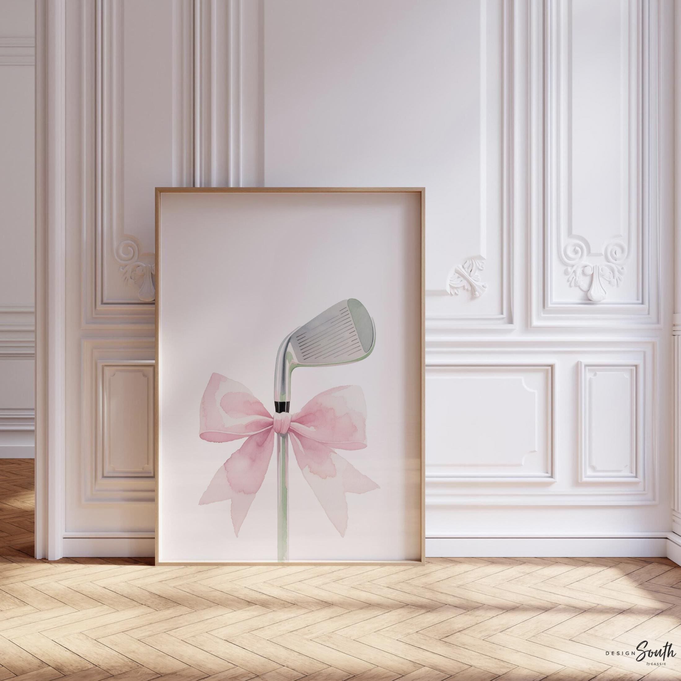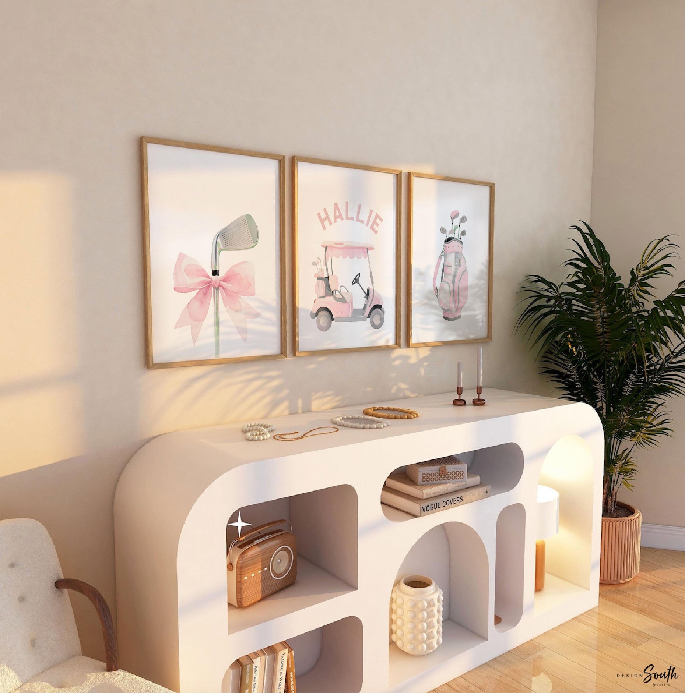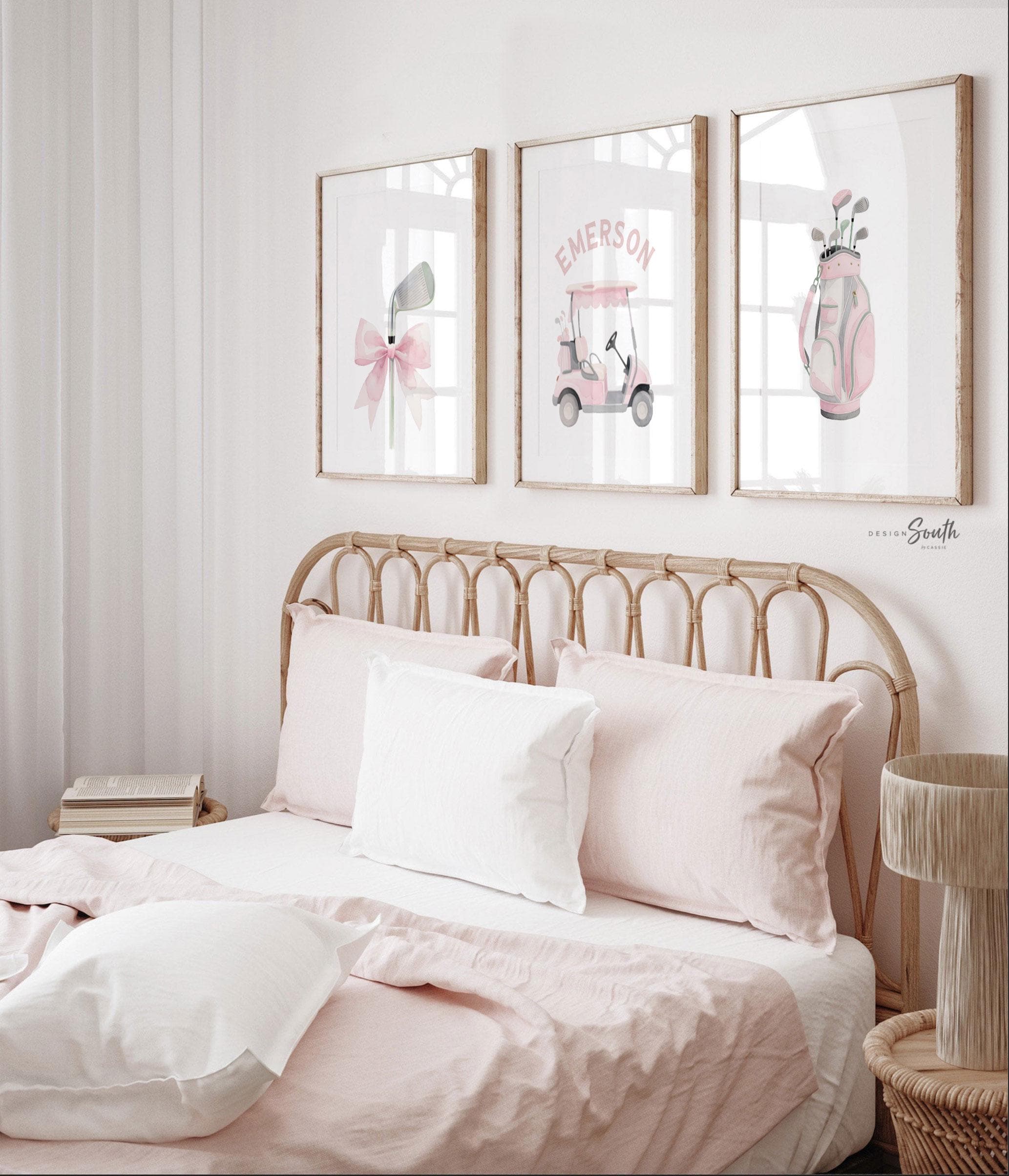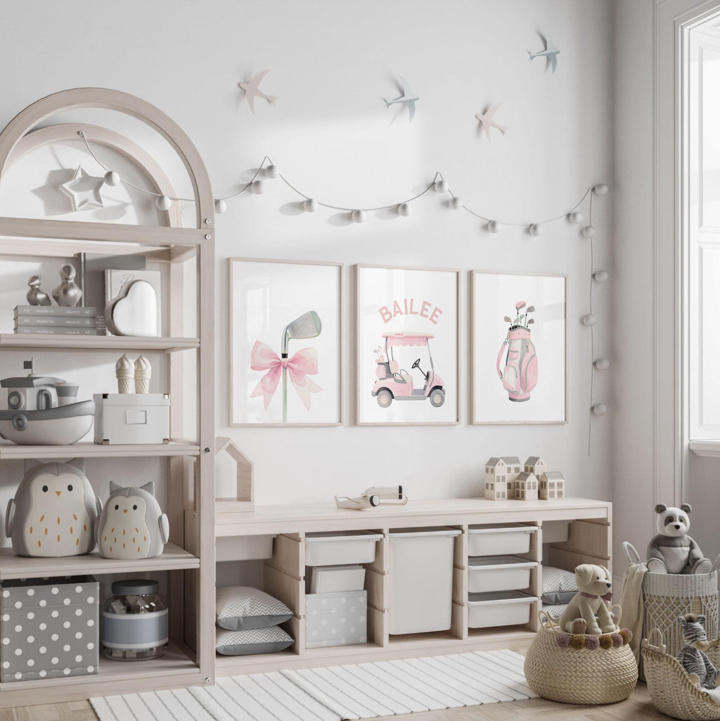 Product description: Original golf theme watercolor prints in shades of pink and gray including a golf club accented with a bow, a golf cart with matching personalized print to be customized with your child's name, and a chic detailed golf bag with clubs. Other options are also available in my shop.