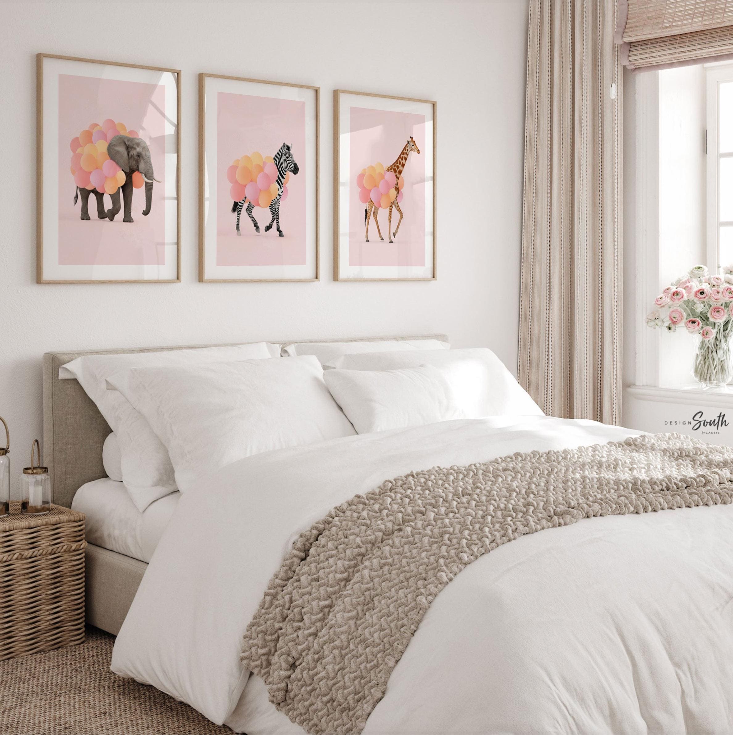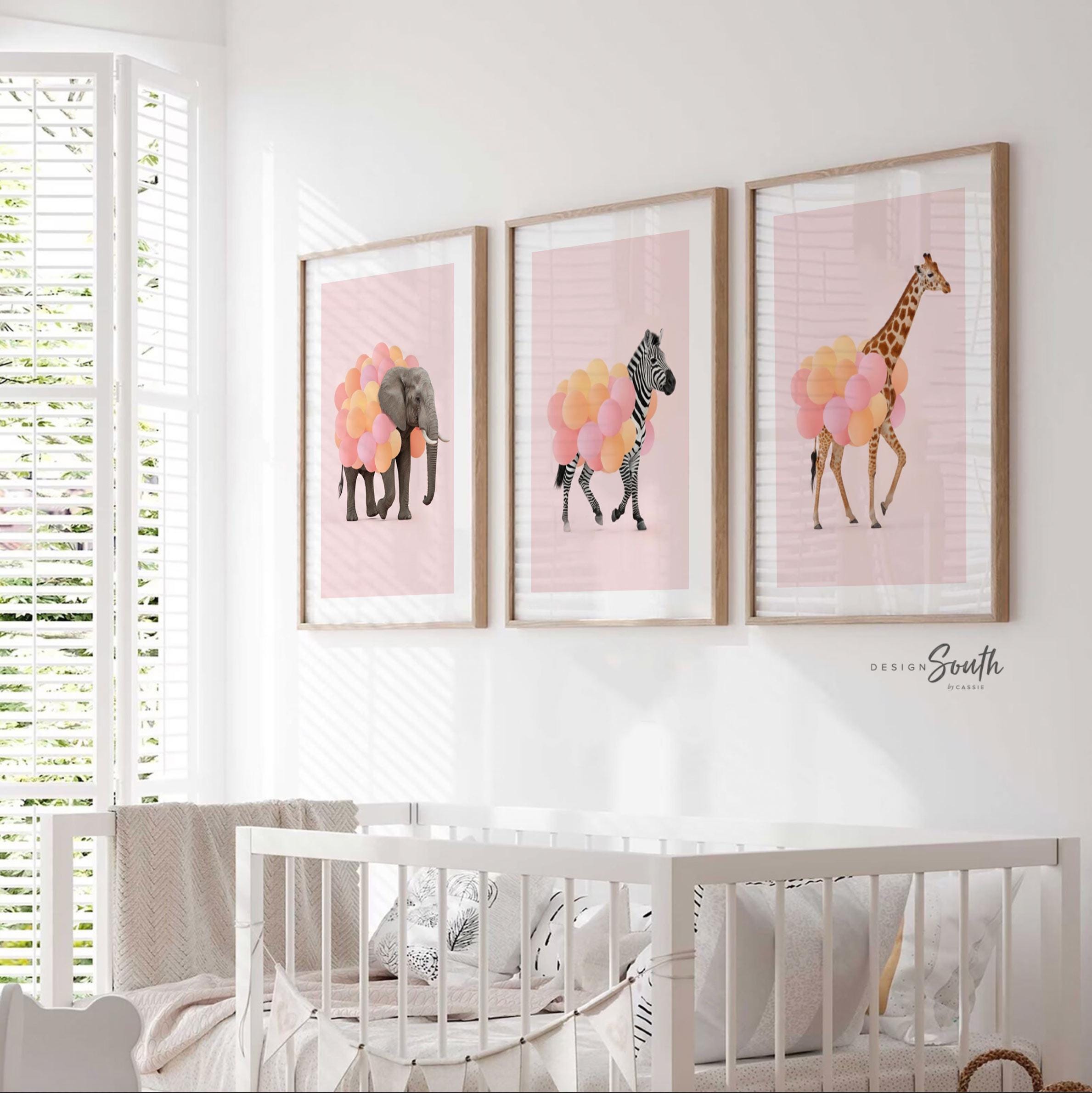 Product description: Safari animal themed wall art print set featuring an elephant, giraffe and zebra accented with balloons in pastel shades of pink and orange. Other options are also available in my shop.