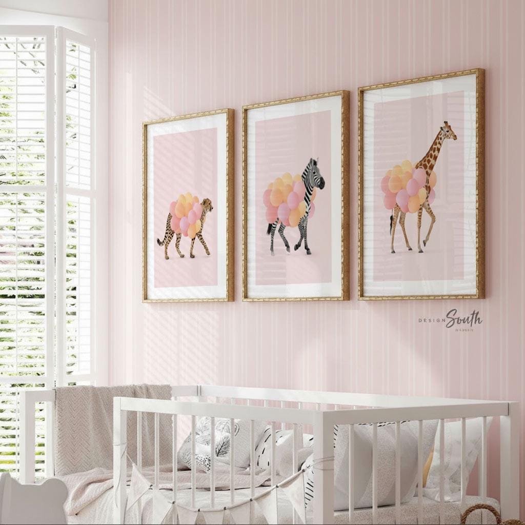 Product description: Safari animal themed wall art print set featuring a cheetah, giraffe and zebra accented with balloons in pastel shades of pink and orange. Other options are also available in my shop.