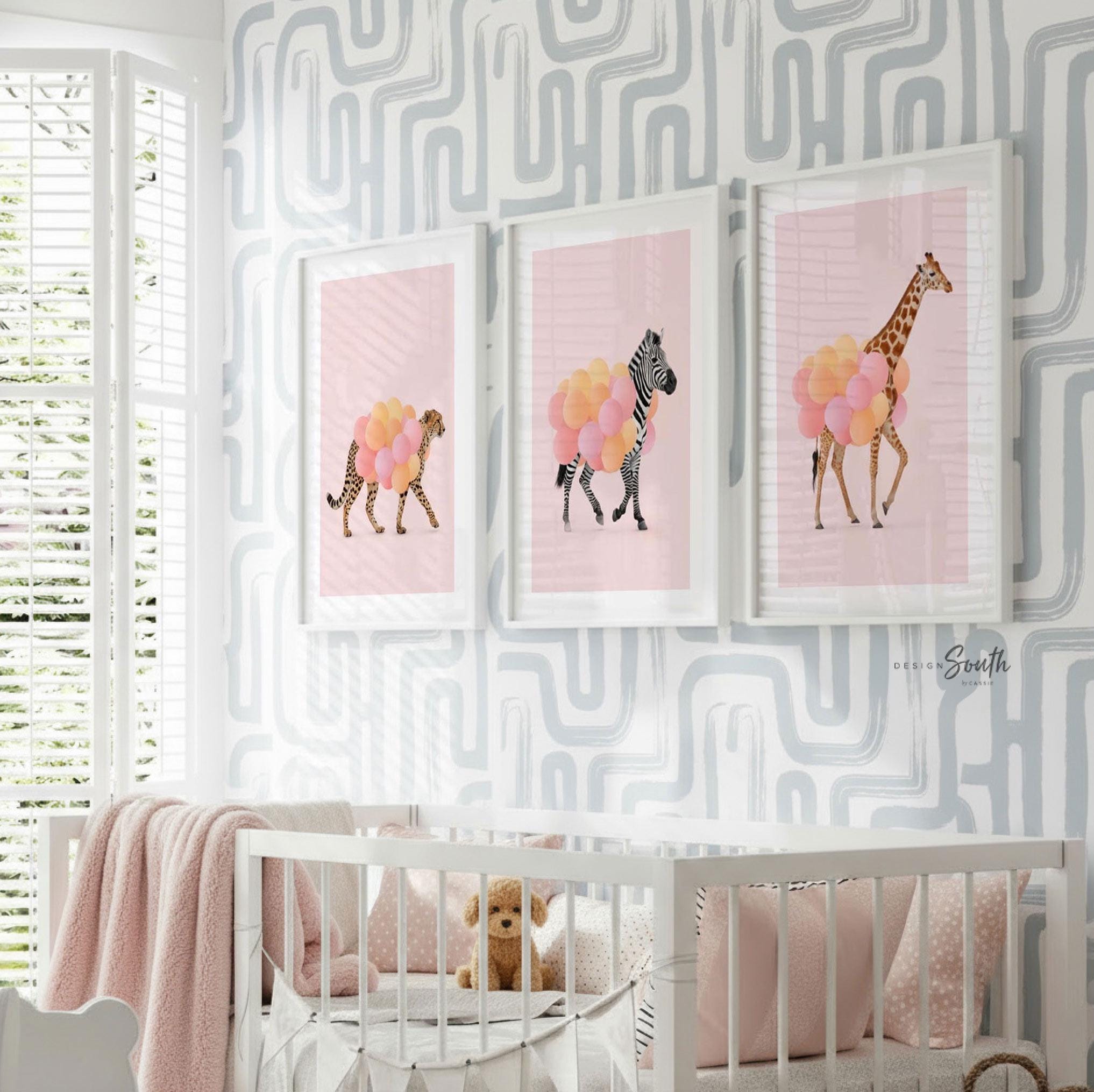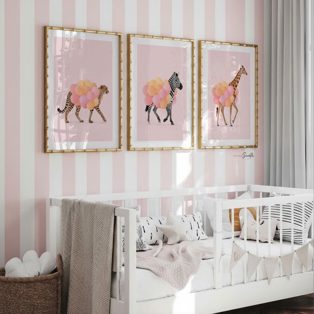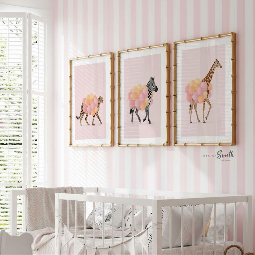 Product description: Safari animal themed wall art print set featuring a cheetah, giraffe and zebra accented with balloons in pastel shades of pink and orange. Other options are also available in my shop.