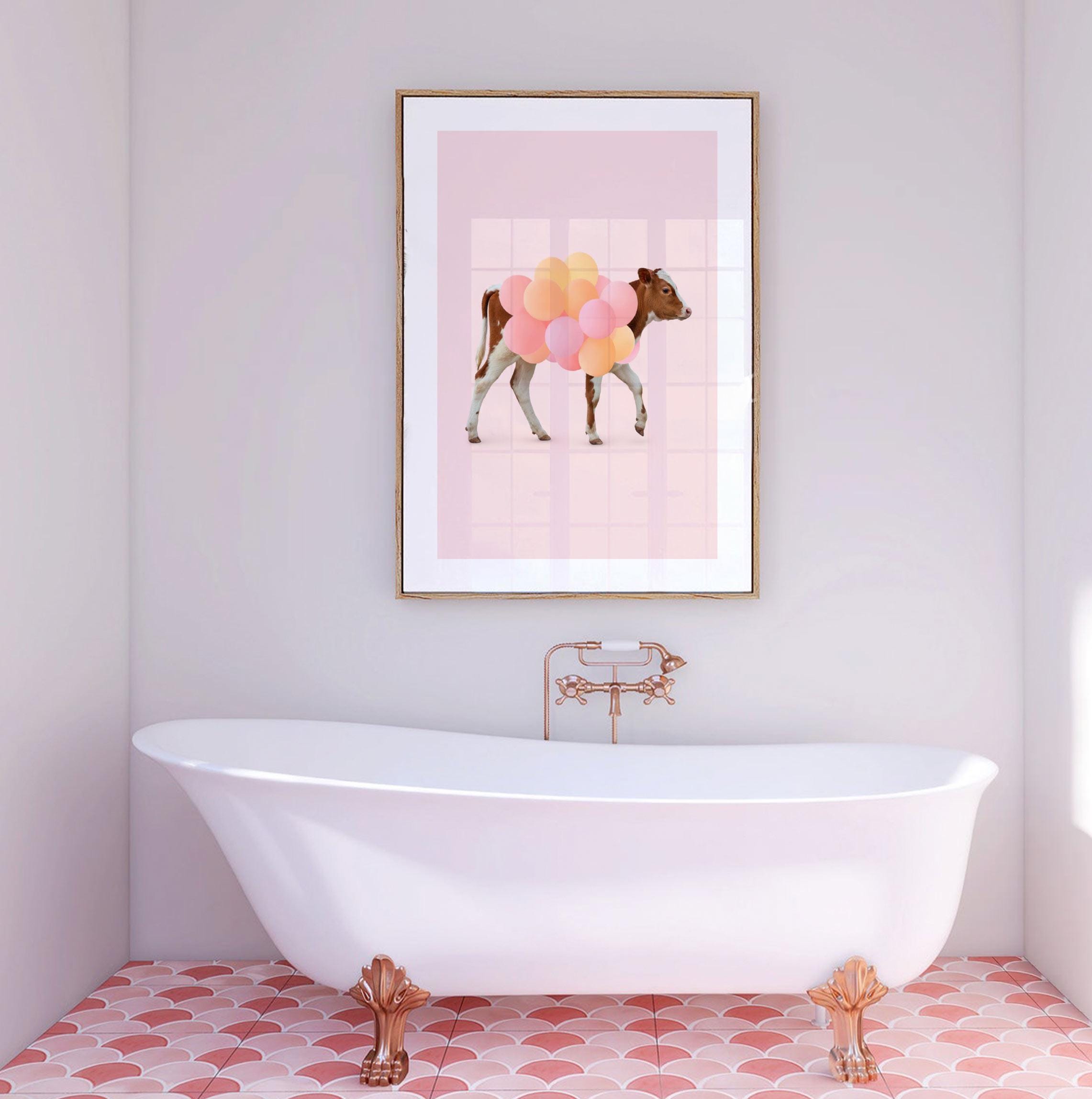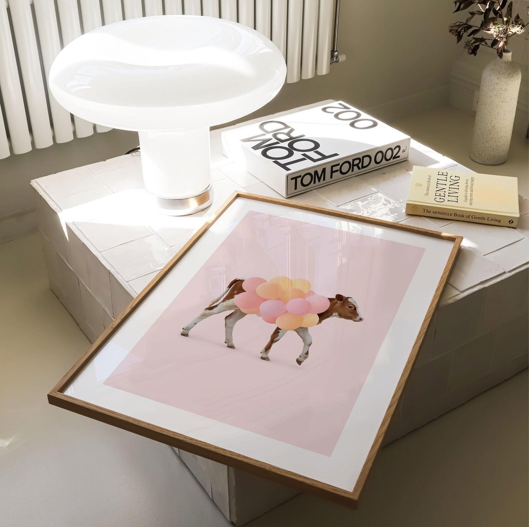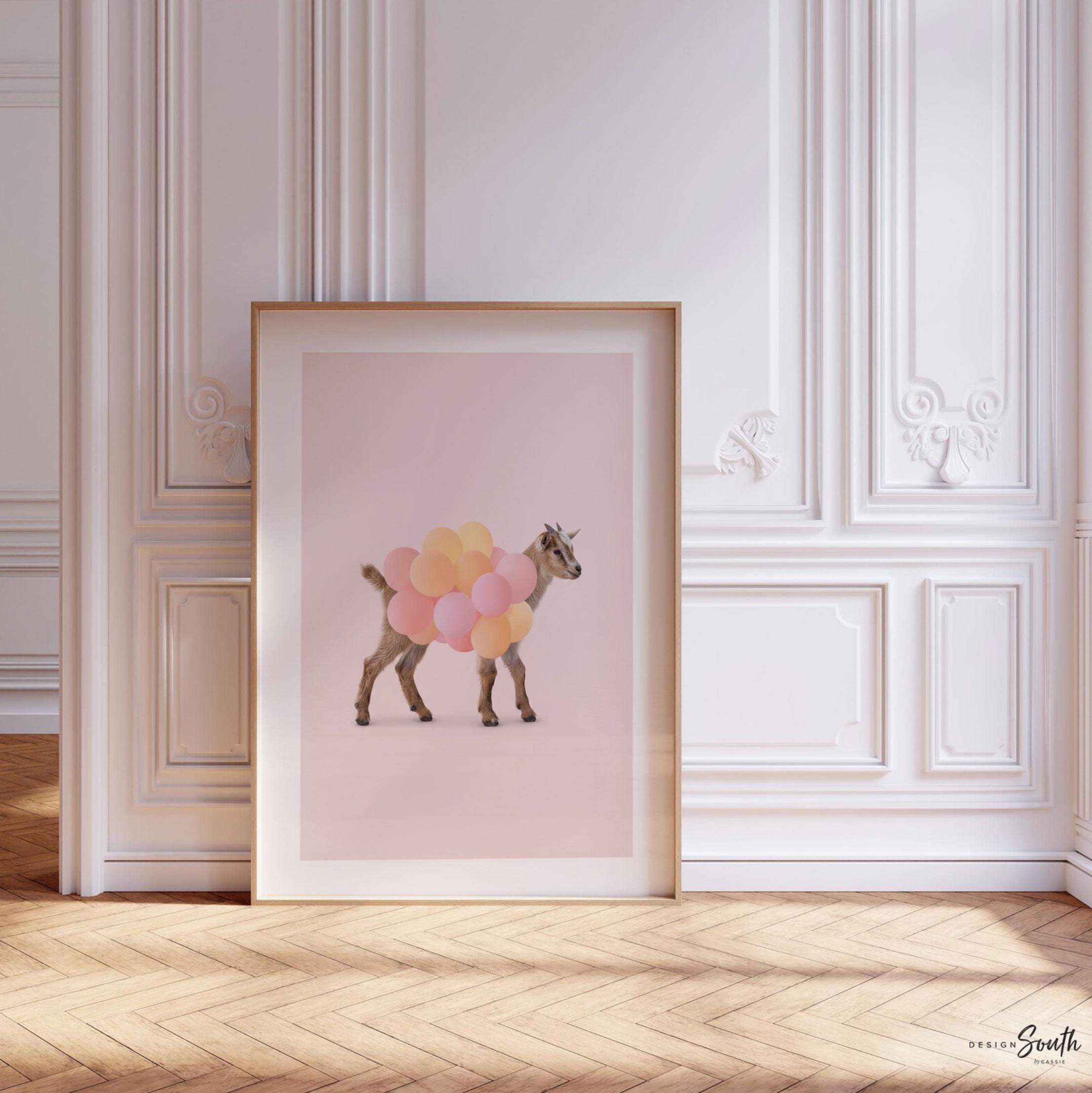 Product description: Farm animal themed wall art print set featuring a pig, goat and cow accented with balloons in pastel shades of pink and orange. Other options are also available in my shop.