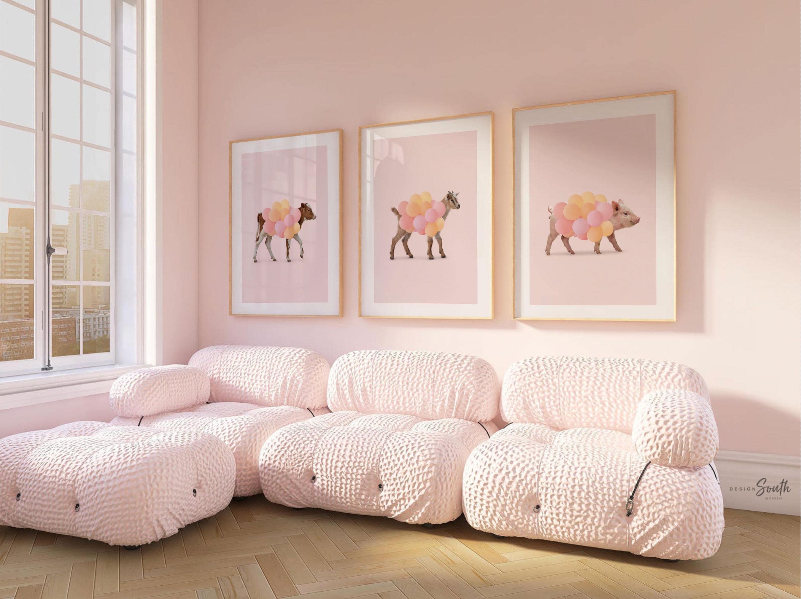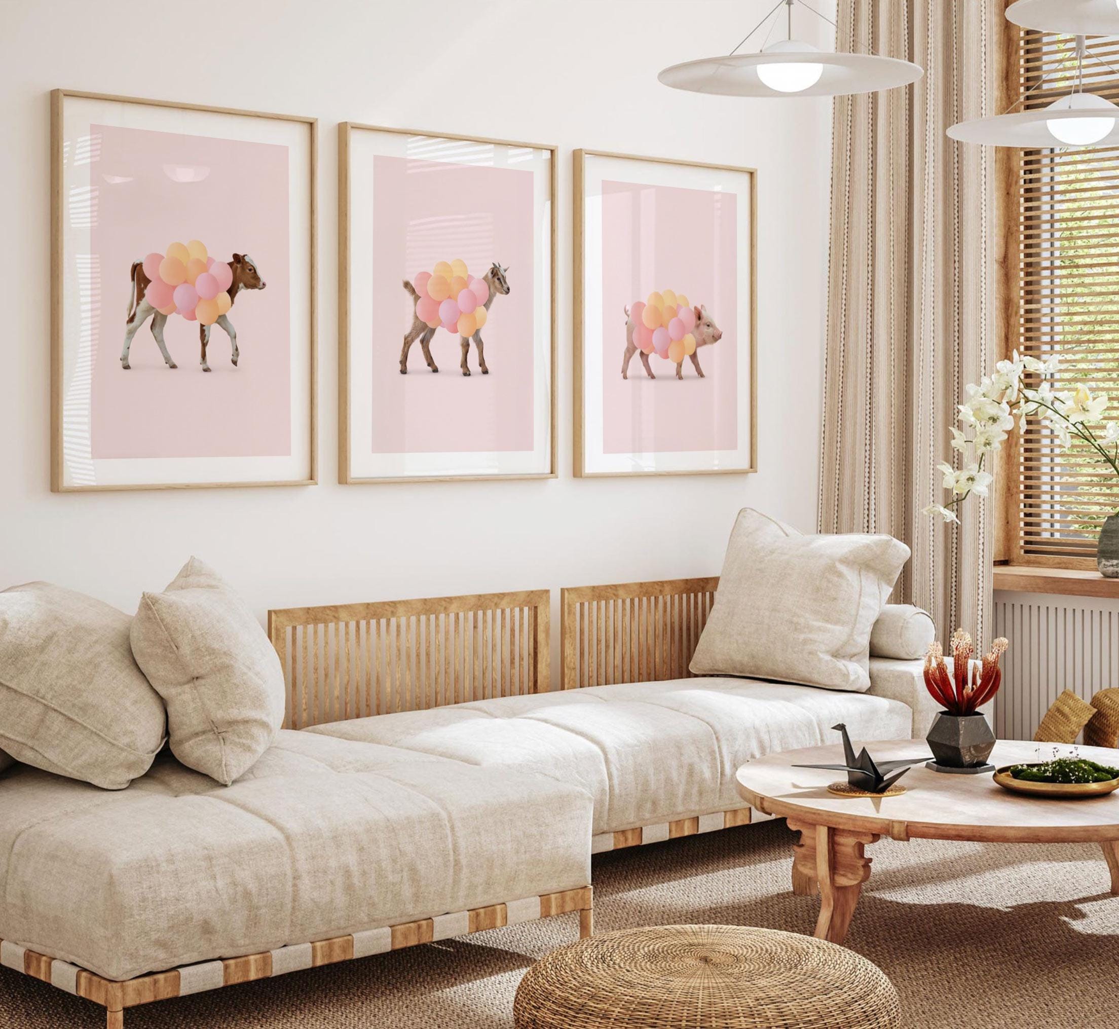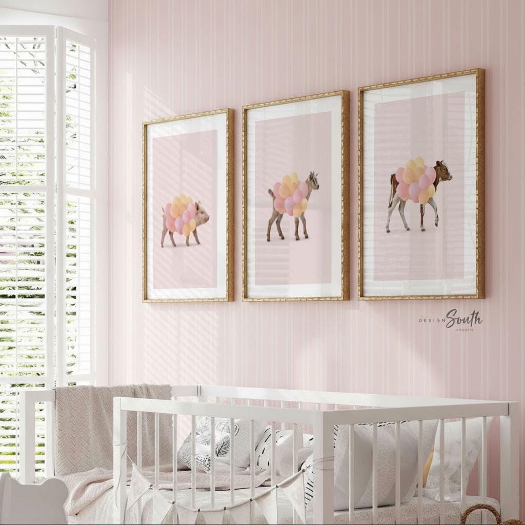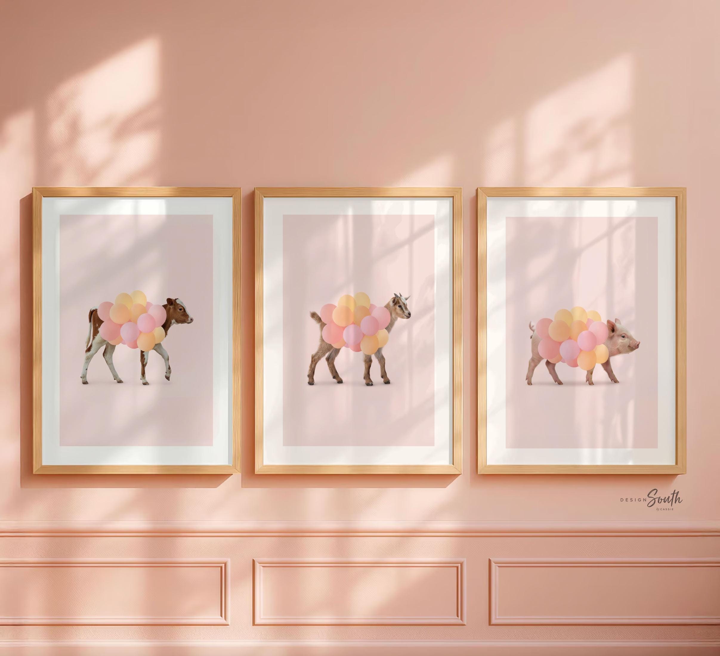 Product description: Farm animal themed wall art print set featuring a pig, goat and cow accented with balloons in pastel shades of pink and orange. Other options are also available in my shop.