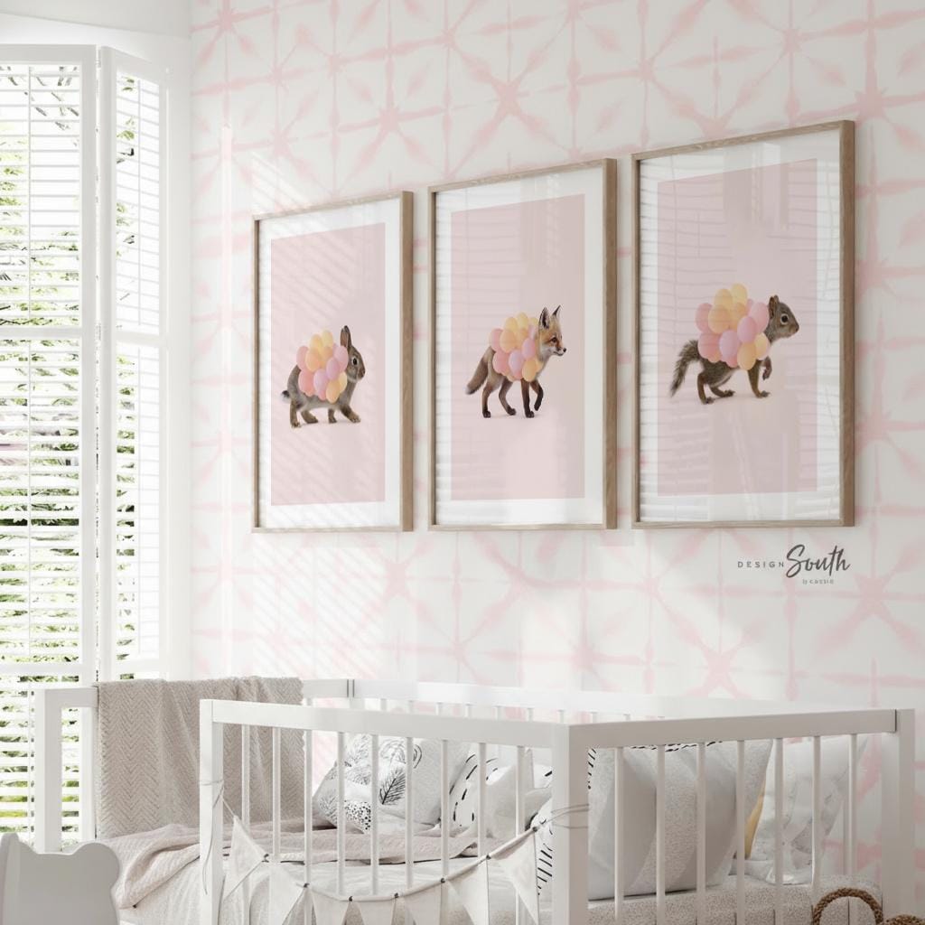 Product description: Woodland animal themed wall art print set featuring a bunny, fox and squirrel accented with balloons in pastel shades of pink and orange. Other options are also available in my shop.
