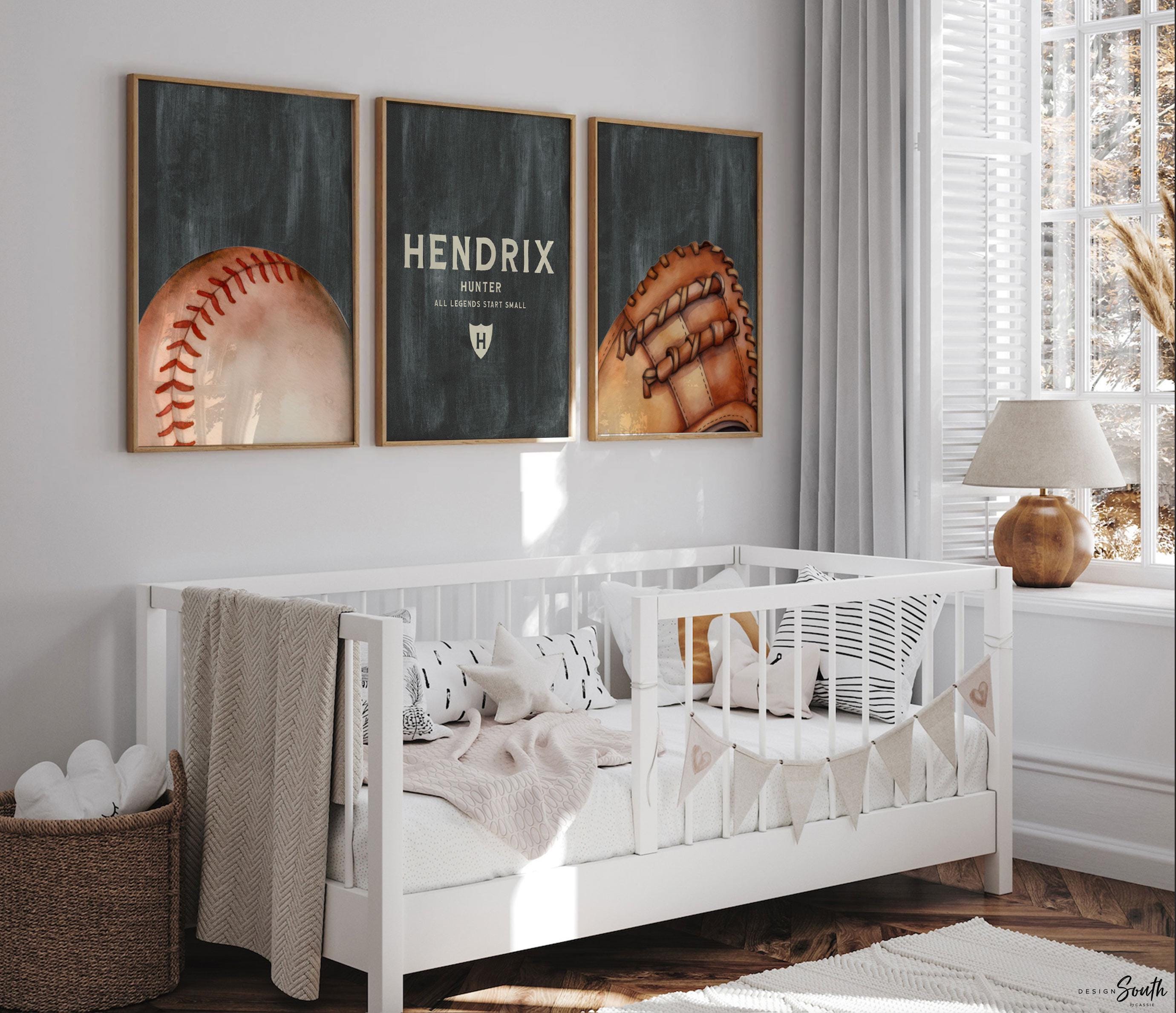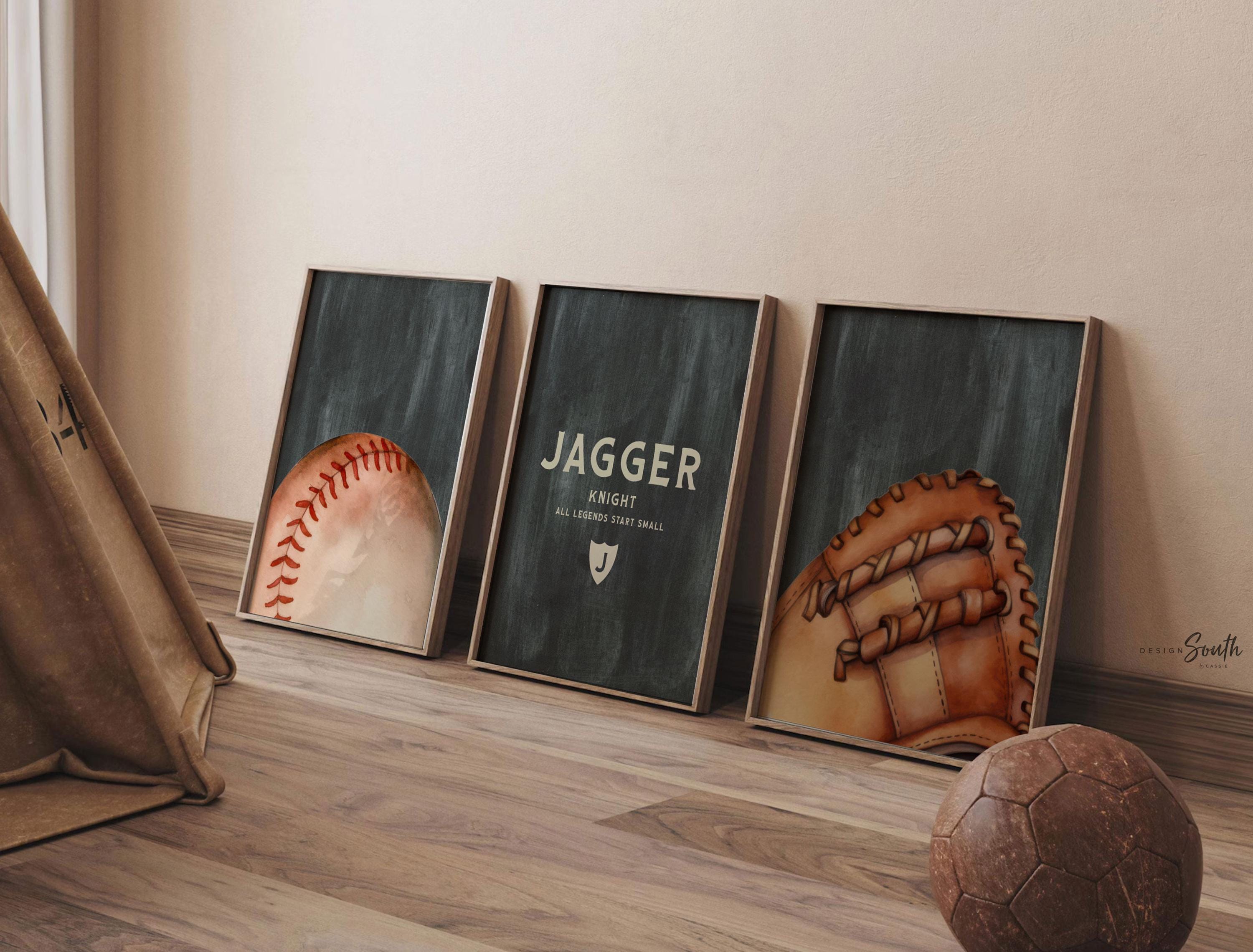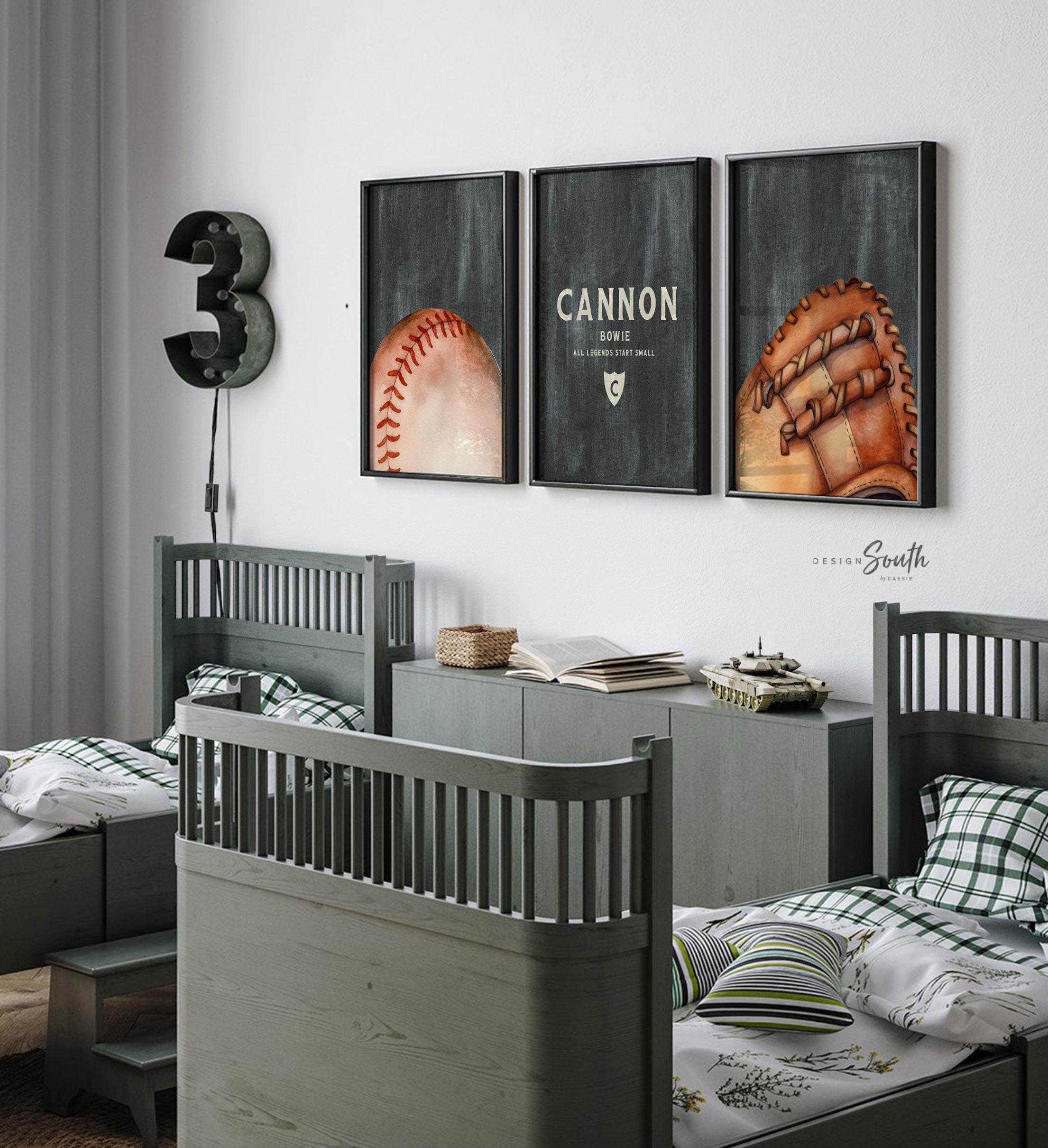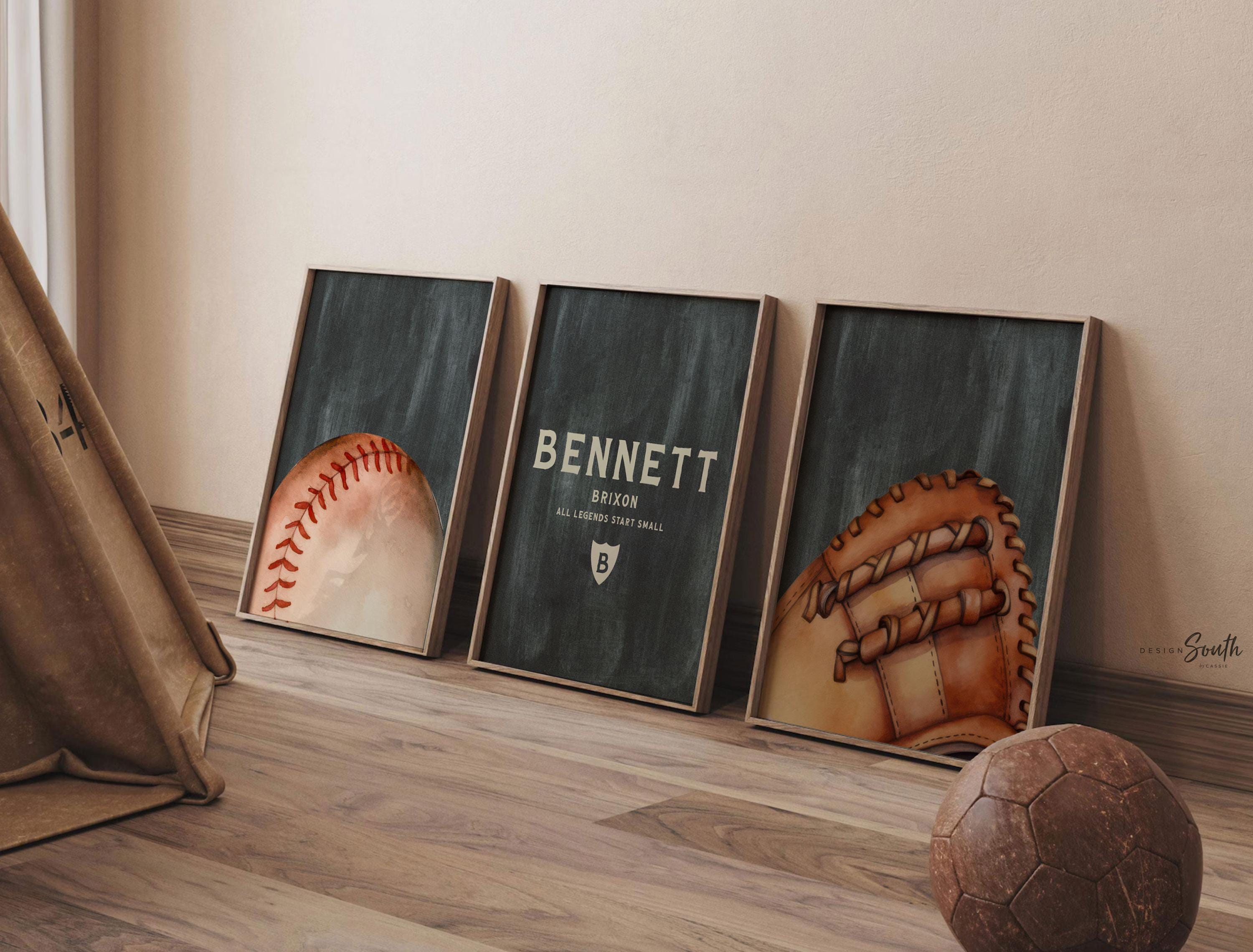 Product description: Baseball theme watercolor prints including a baseball, glove and matching personalized print to be customized with your child's name. Saying on personalized print reads, "All Legends Start Small." Other options are also available in my shop.