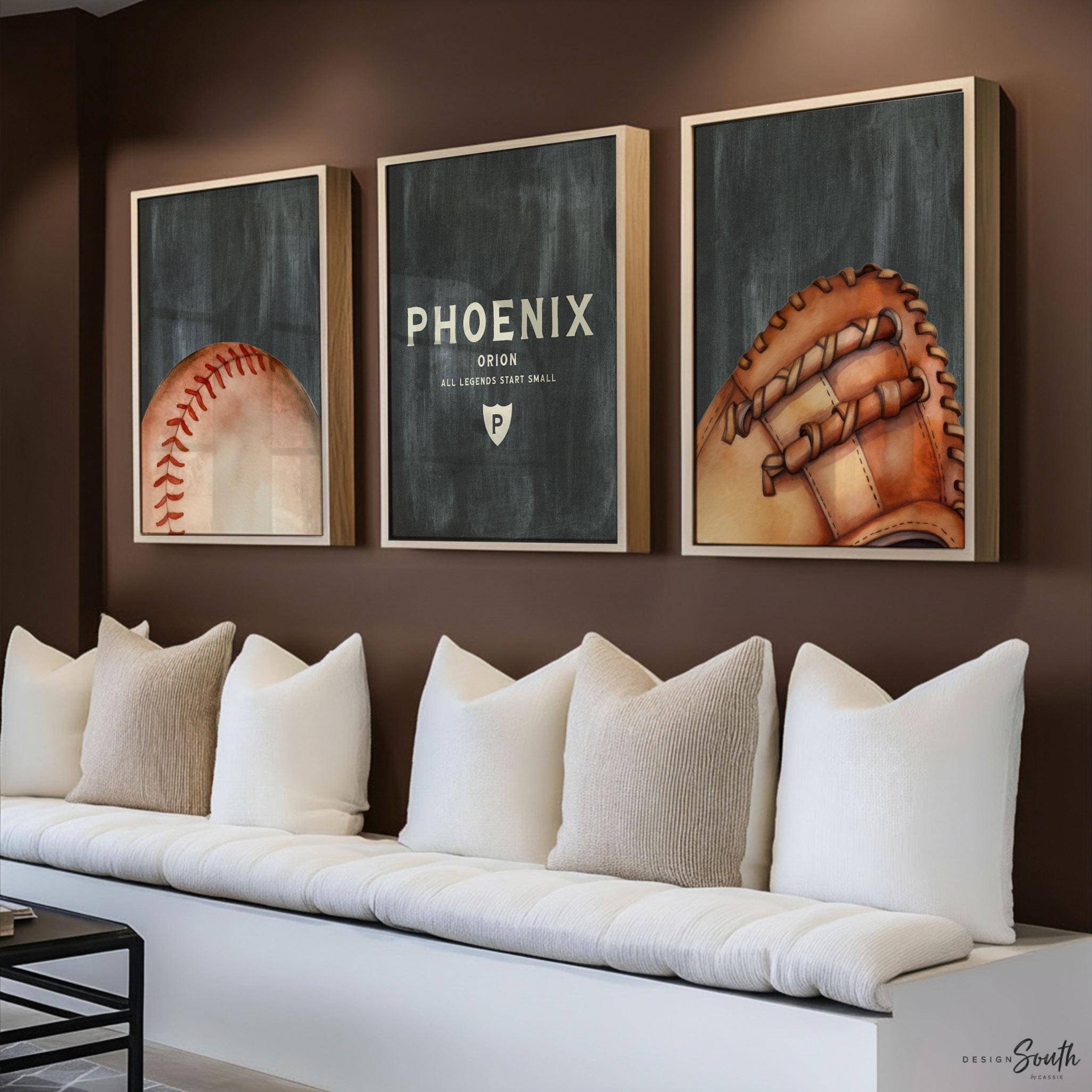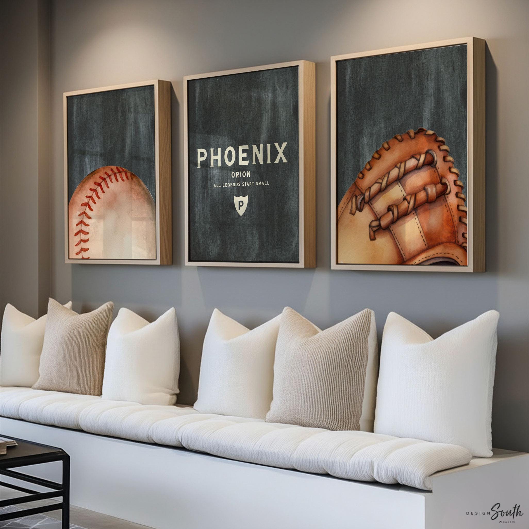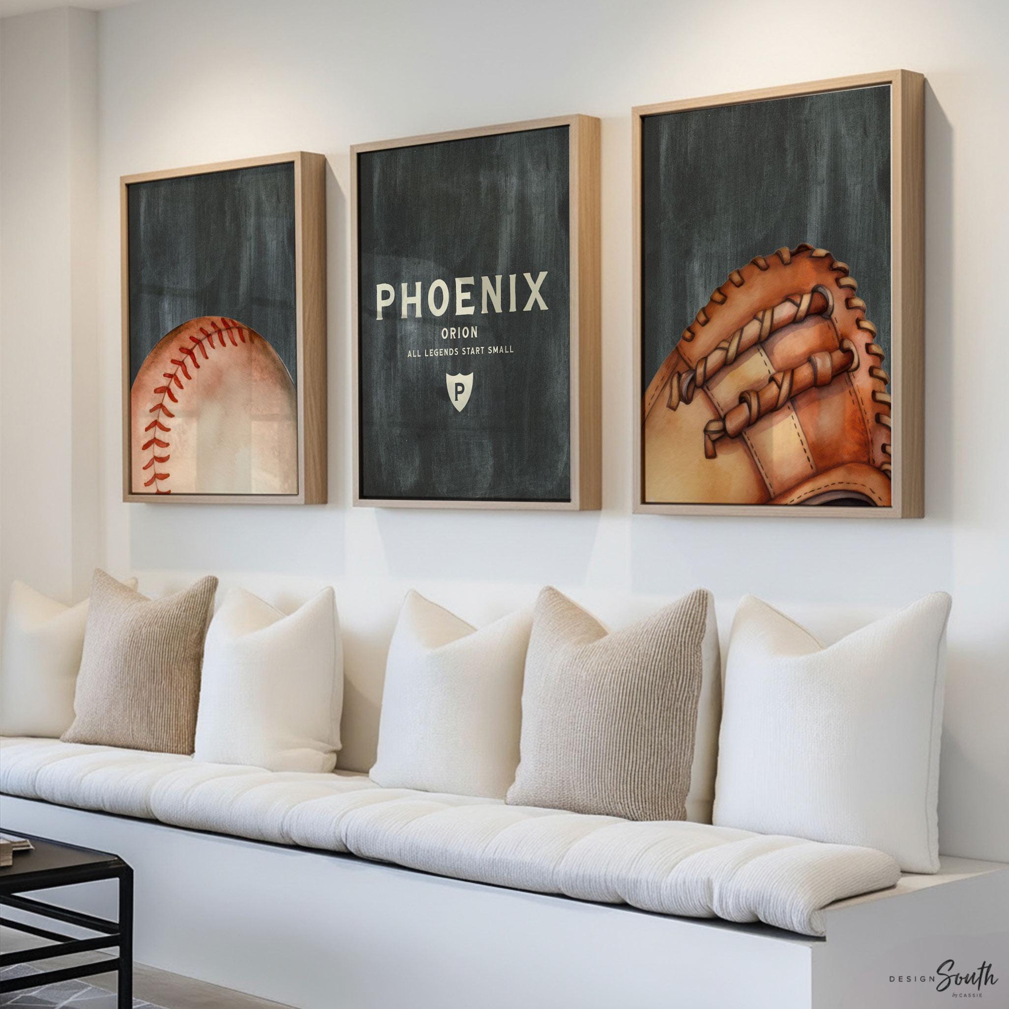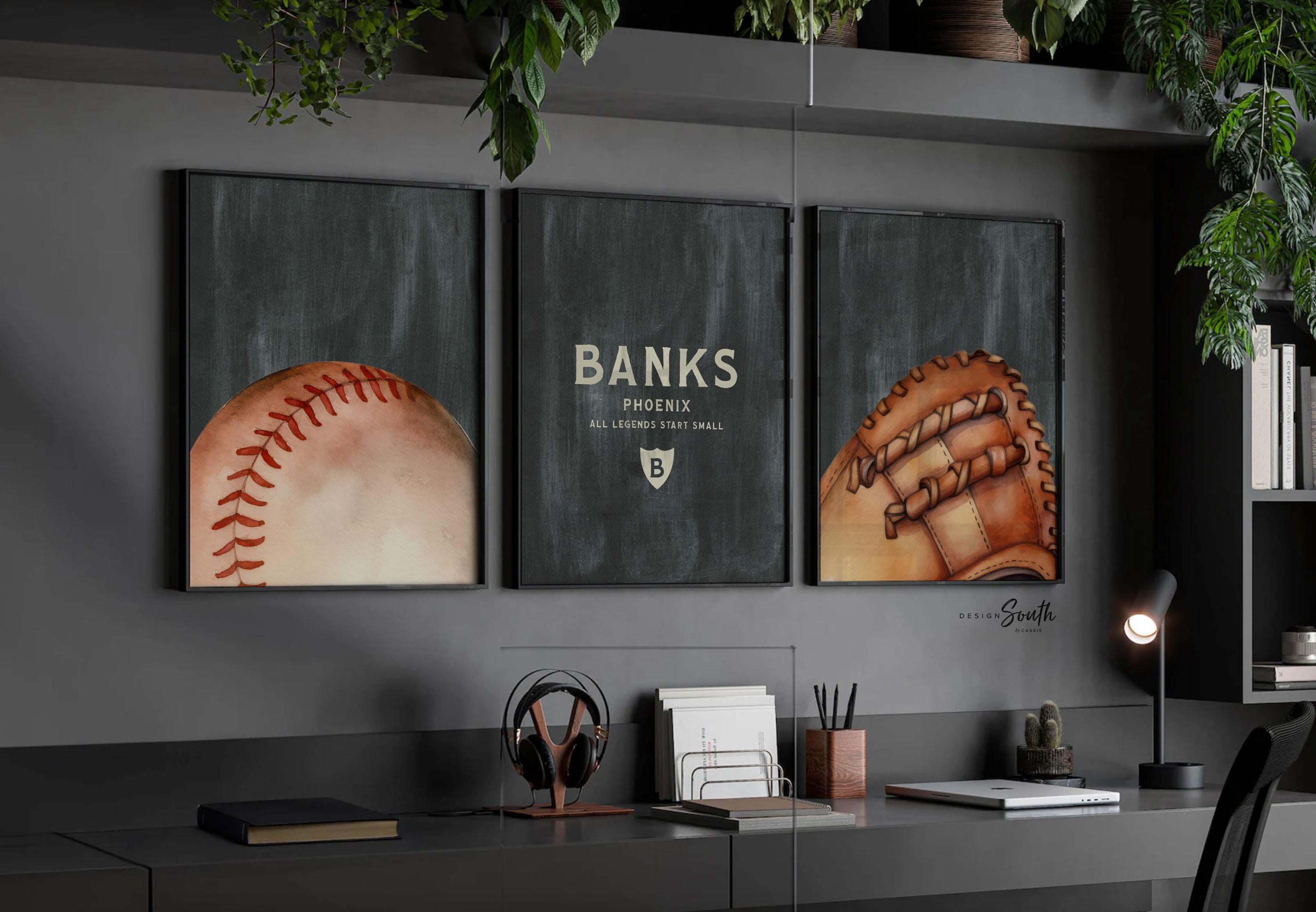 Product description: Baseball theme watercolor prints including a baseball, glove and matching personalized print to be customized with your child's name. Saying on personalized print reads, "All Legends Start Small." Other options are also available in my shop.