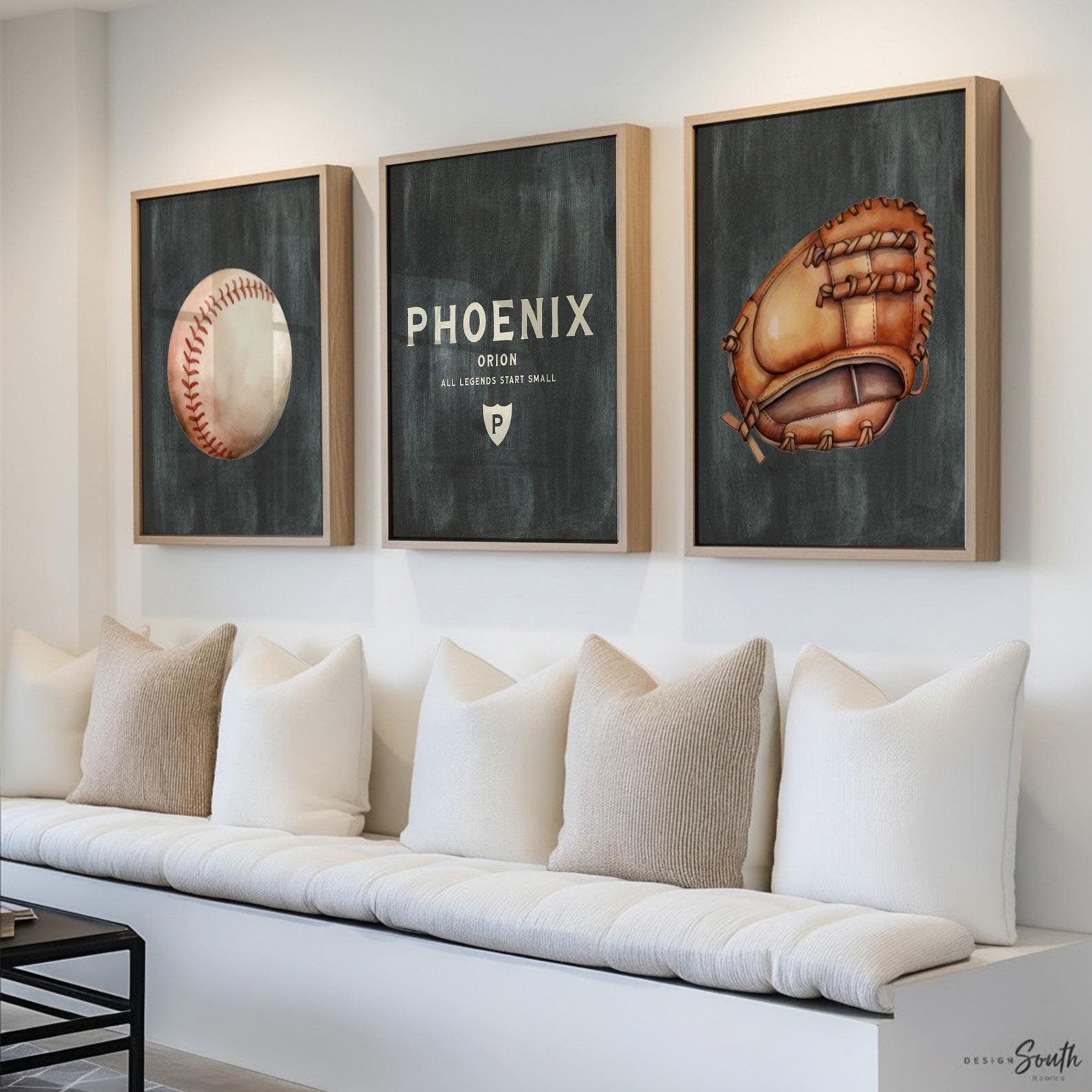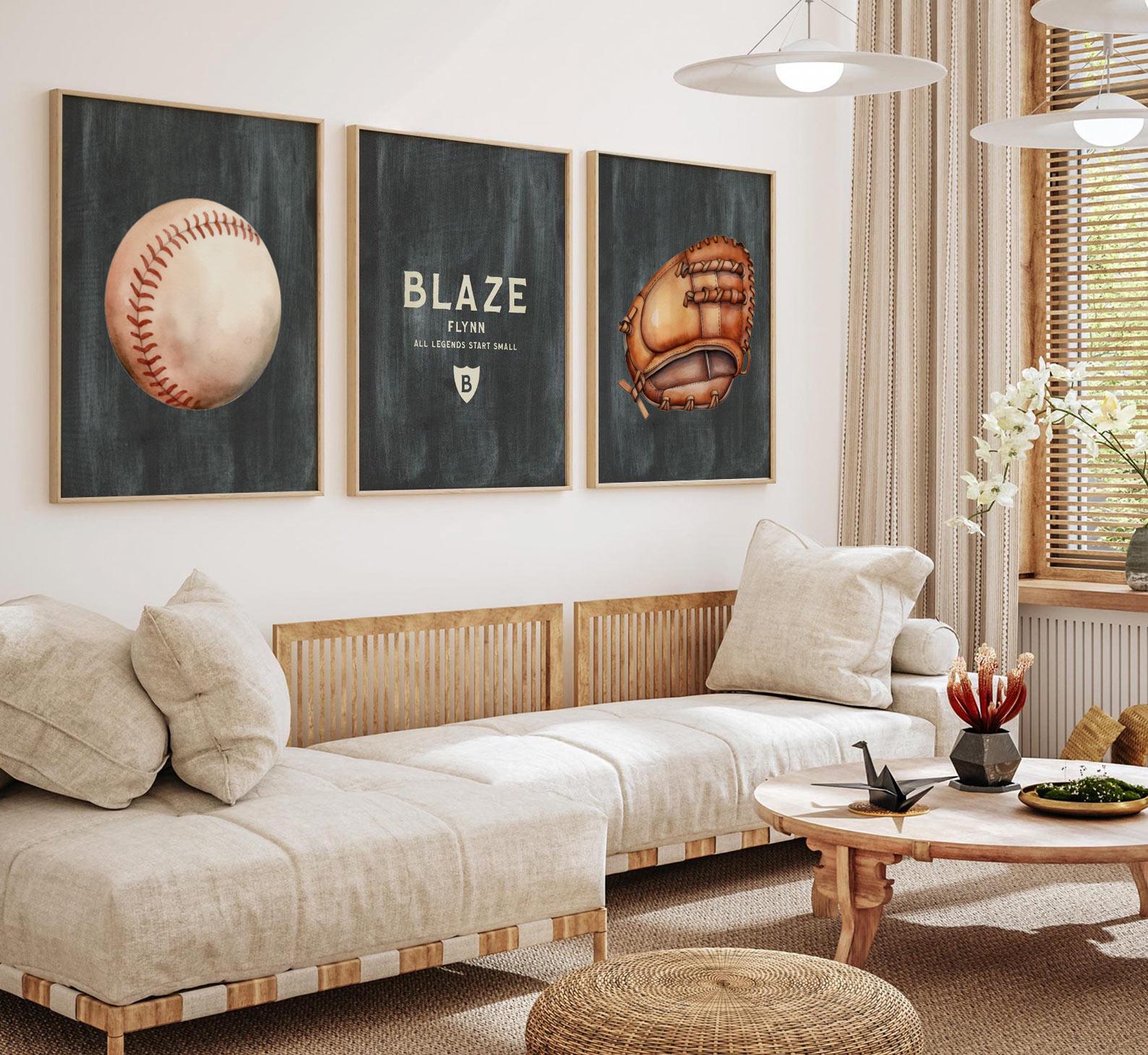 Product description: Baseball theme watercolor prints including a baseball, glove and matching personalized print to be customized with your child's name. Saying on personalized print reads, "All Legends Start Small." Other options are also available in my shop.