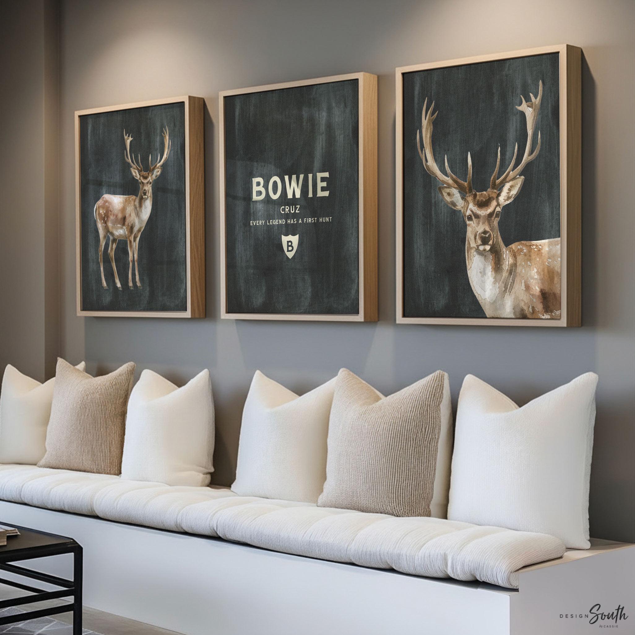 Product description: Watercolor buck deer prints in neutral tones with matching print to be customized with your child's name. Quote under the name states, “Every Legend Has a First Hunt.” Other options are also available in my shop.