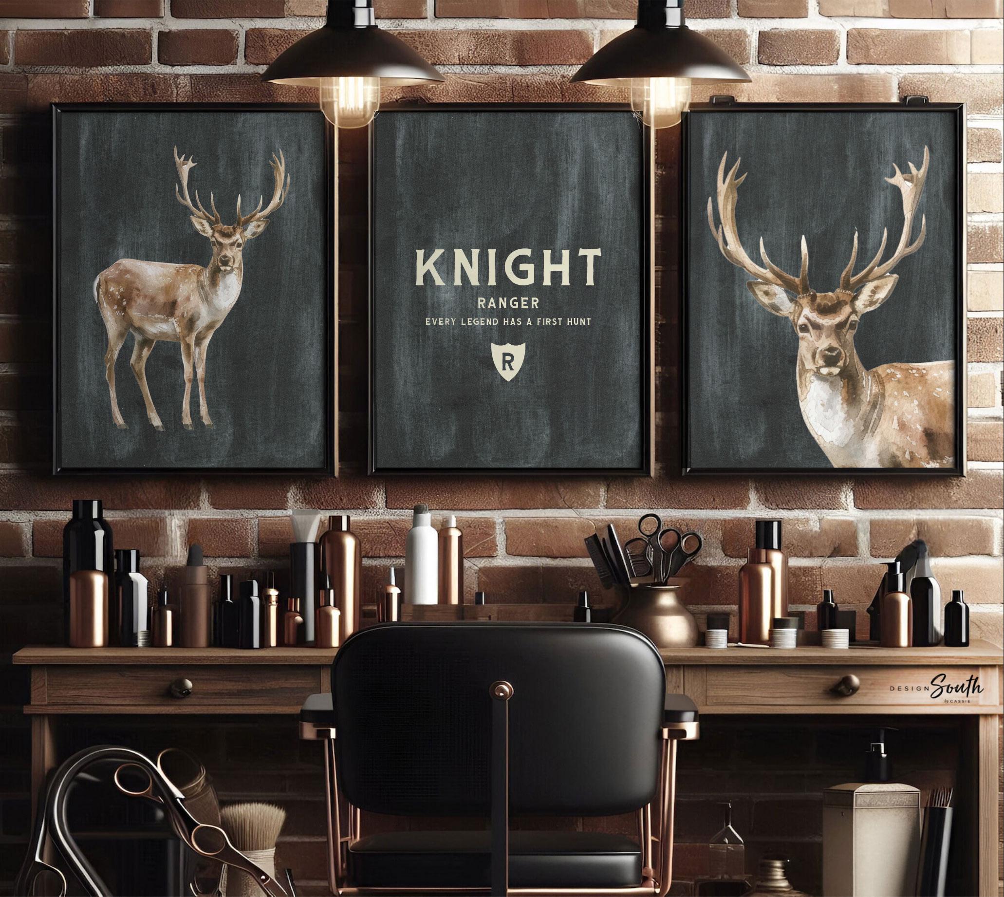 Product description: Watercolor buck deer prints in neutral tones with matching print to be customized with your child's name. Quote under the name states, “Every Legend Has a First Hunt.” Other options are also available in my shop.