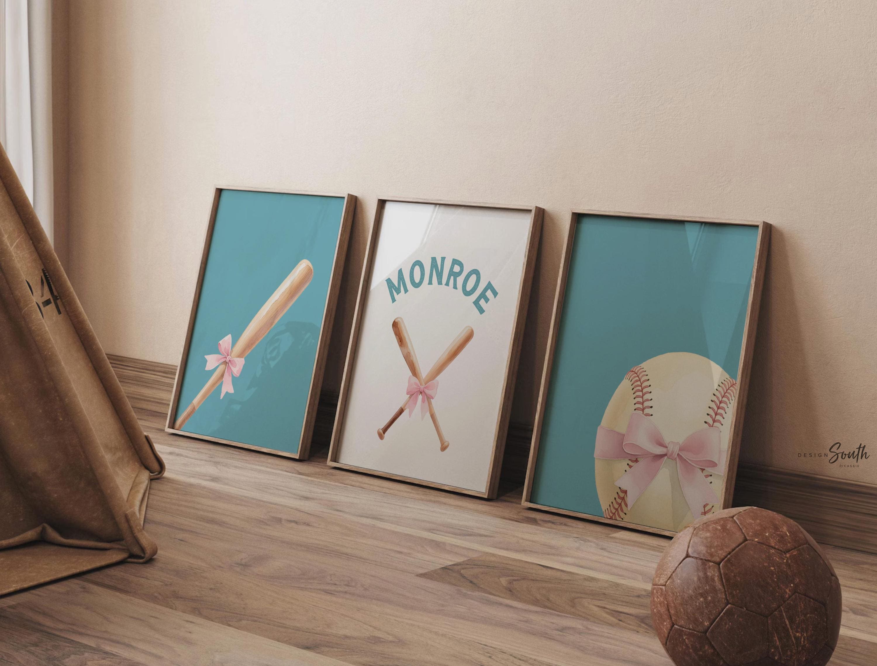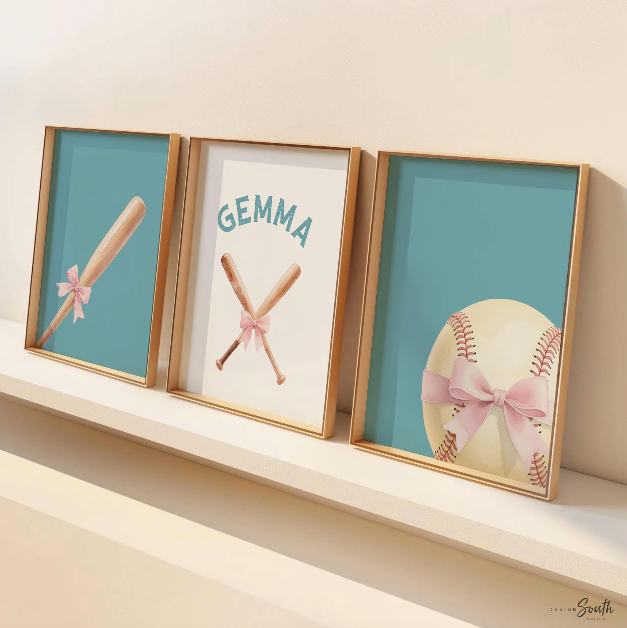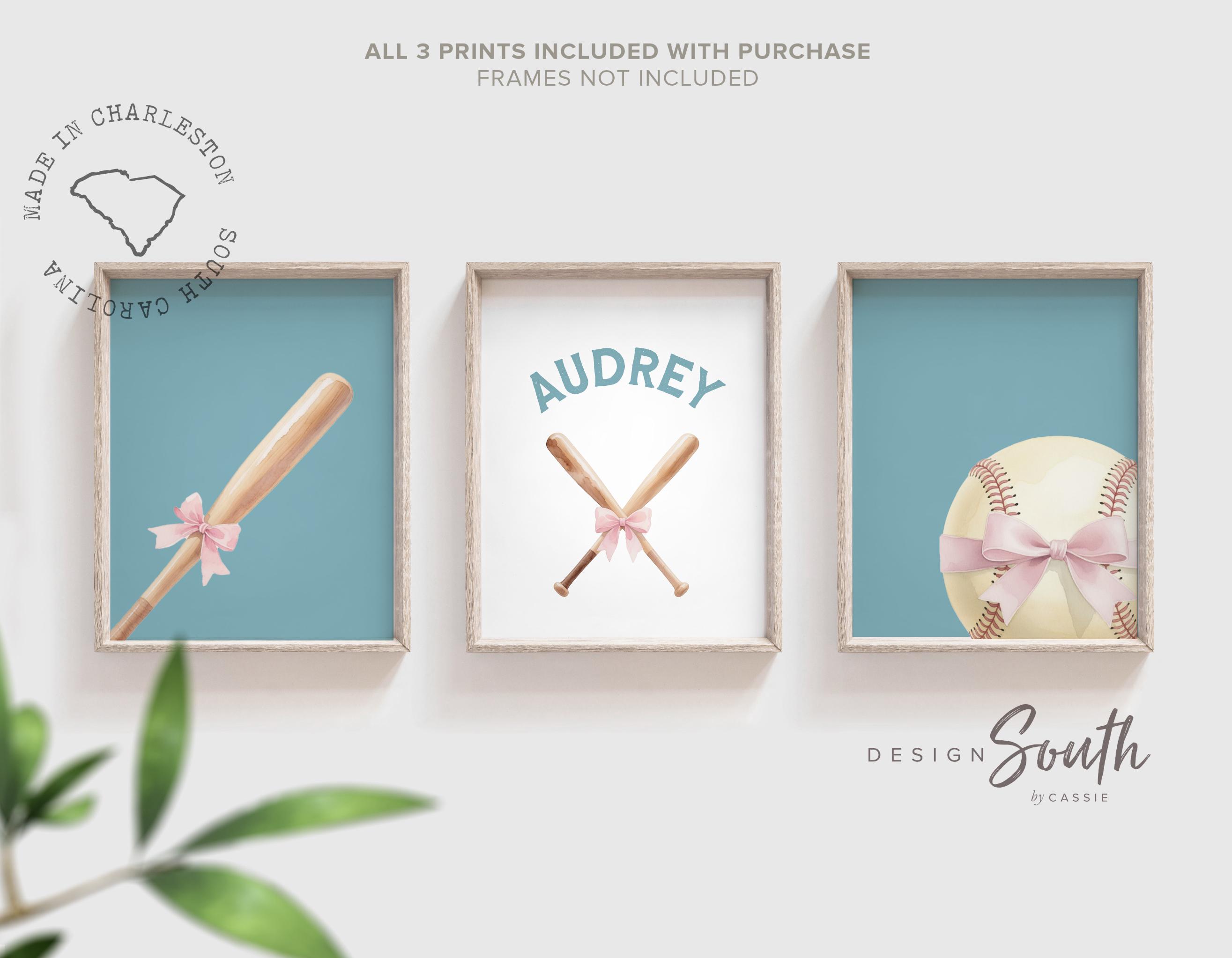 Product description: Softball theme watercolor prints including a softball and baseball bat accented with bows, and matching personalized print to be customized with your child's name. Background color is 'Lop.' Other options are also available in my shop.