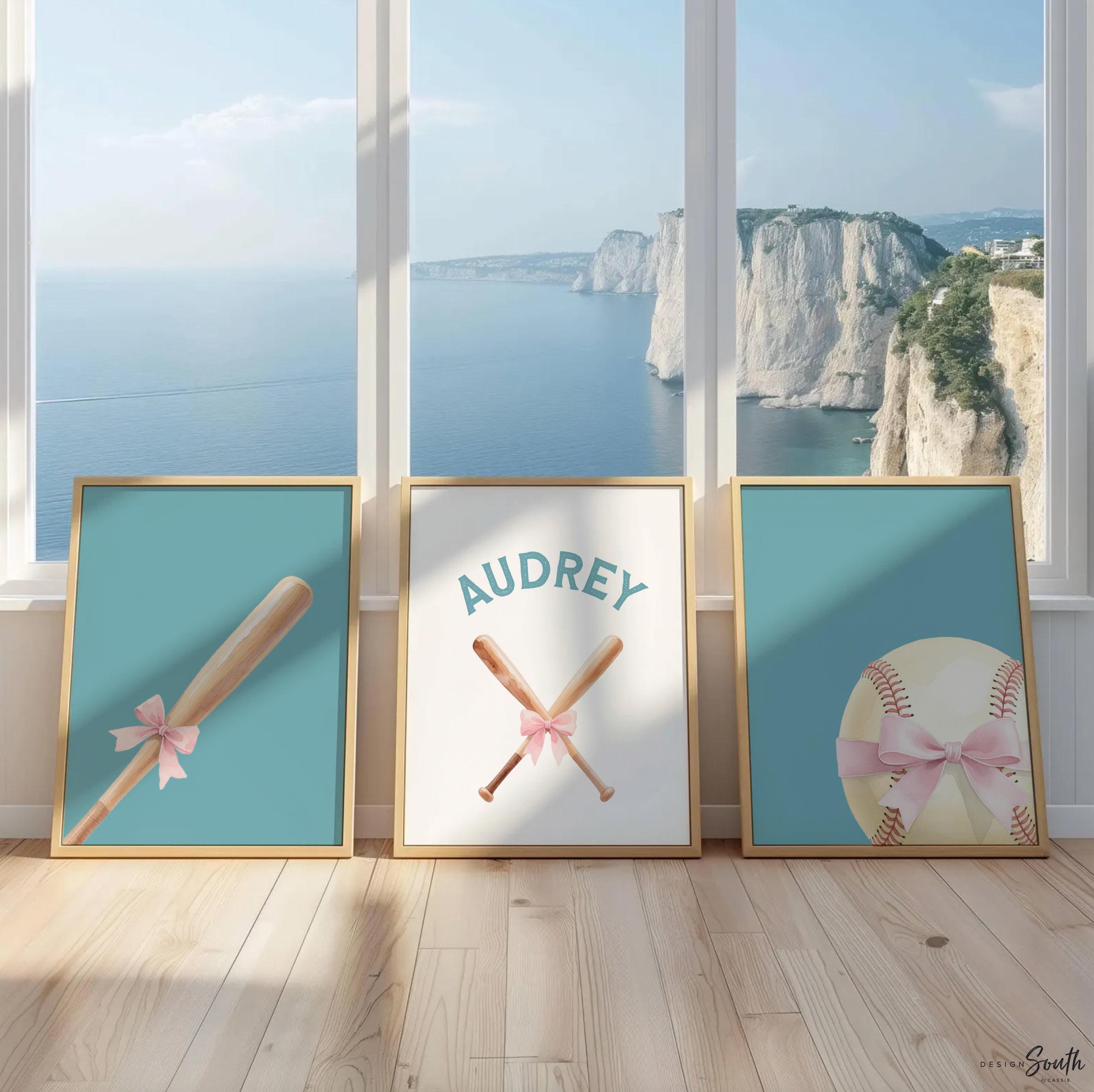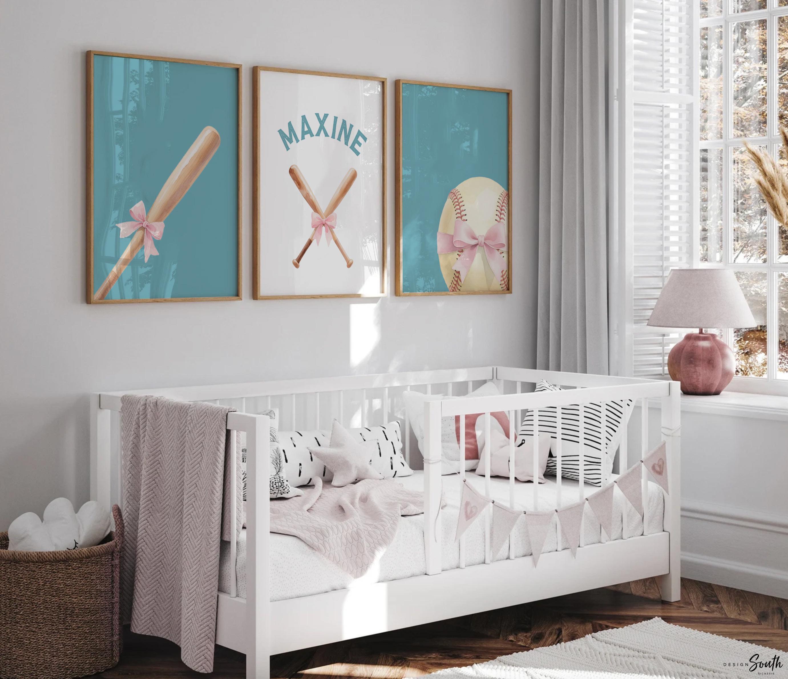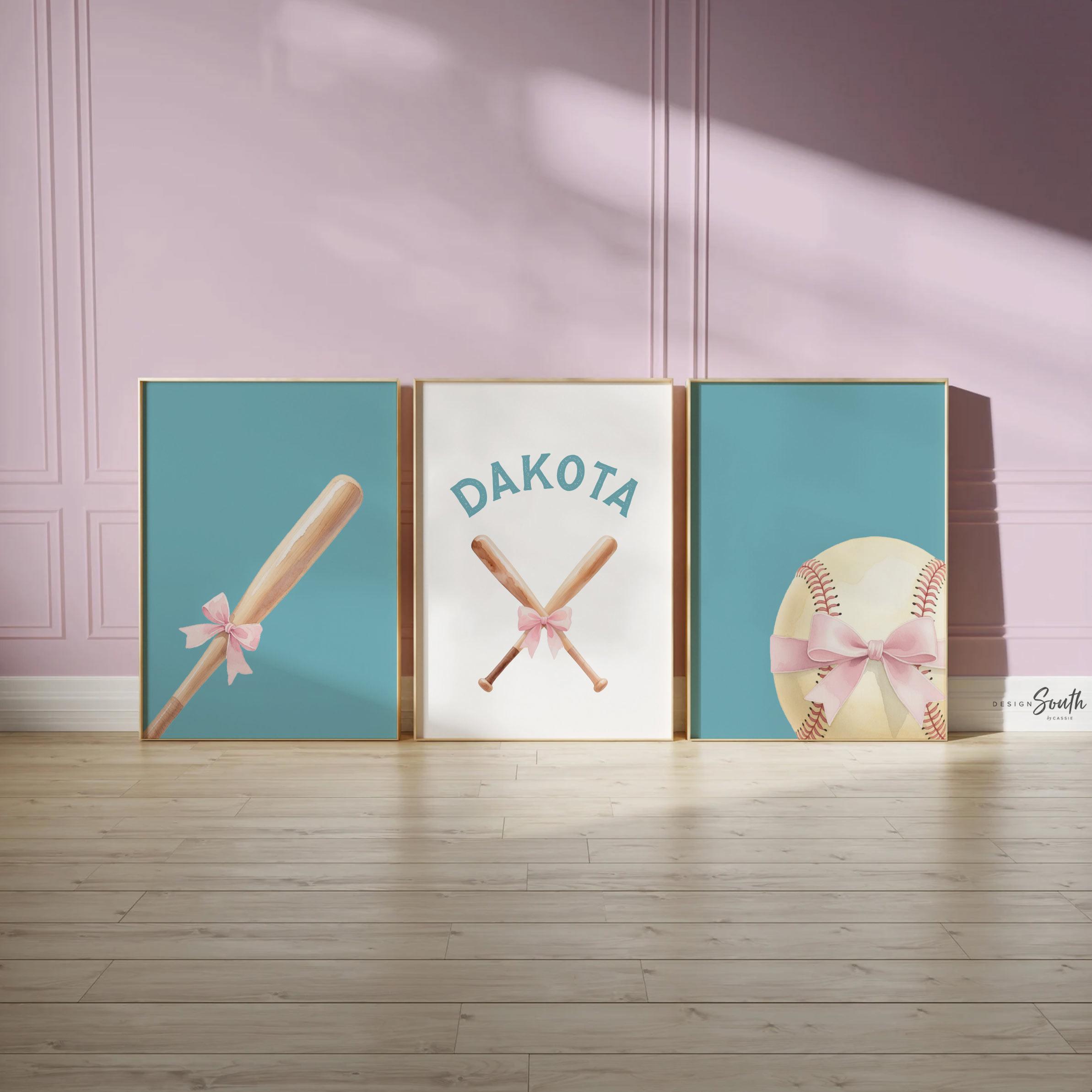 Product description: Softball theme watercolor prints including a softball and baseball bat accented with bows, and matching personalized print to be customized with your child's name. Background color is 'Lop.' Other options are also available in my shop.