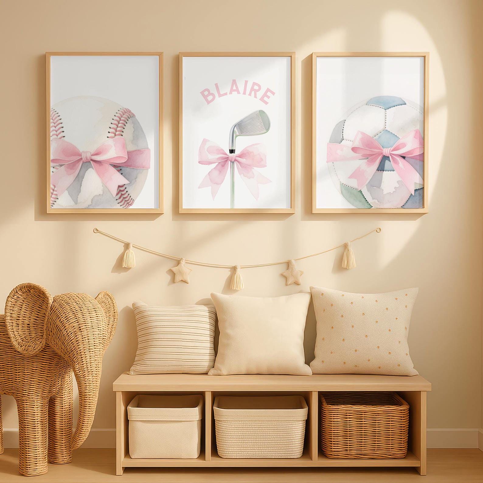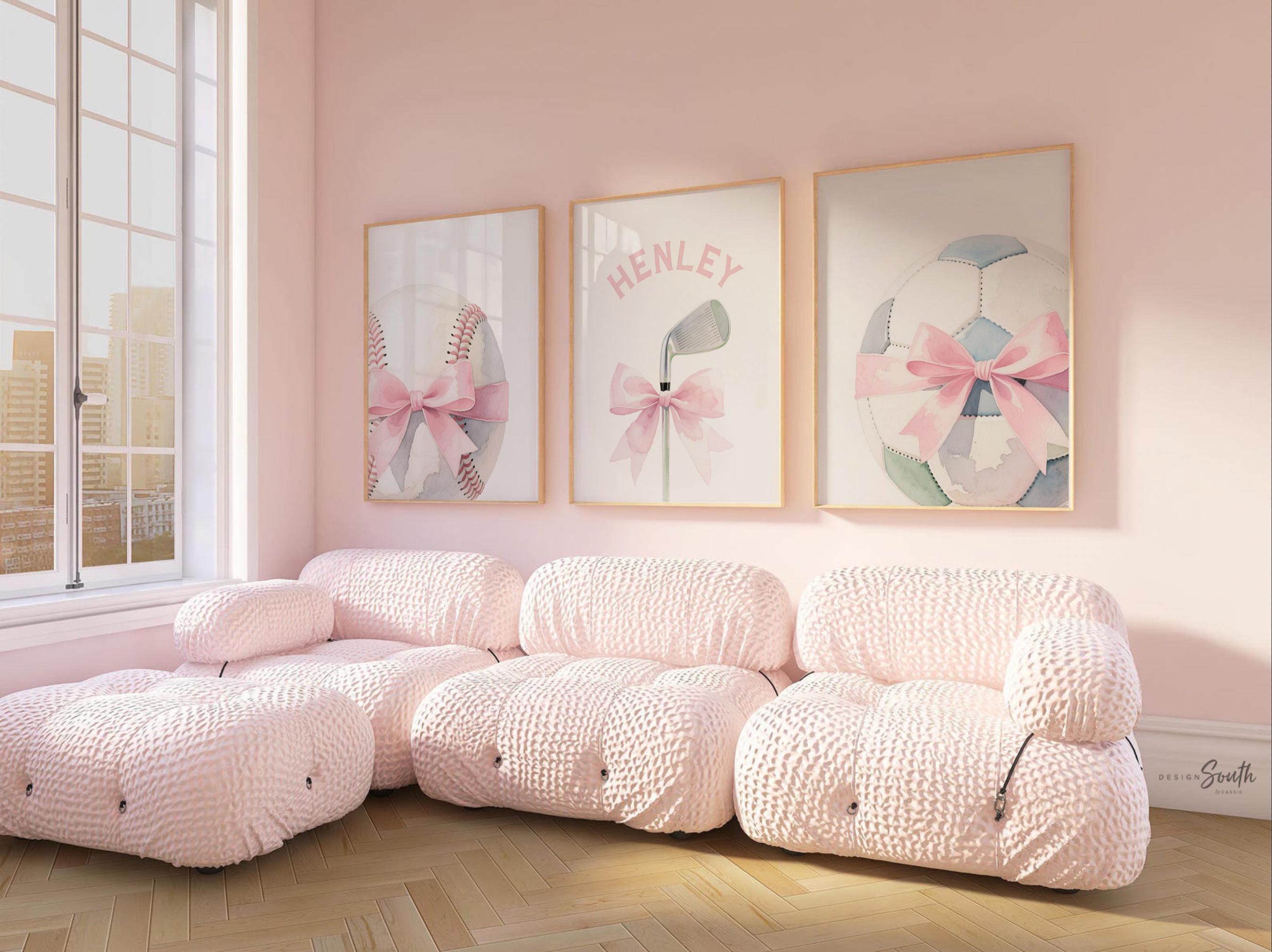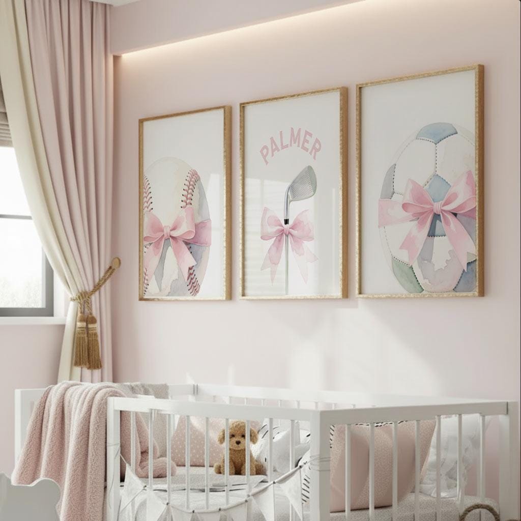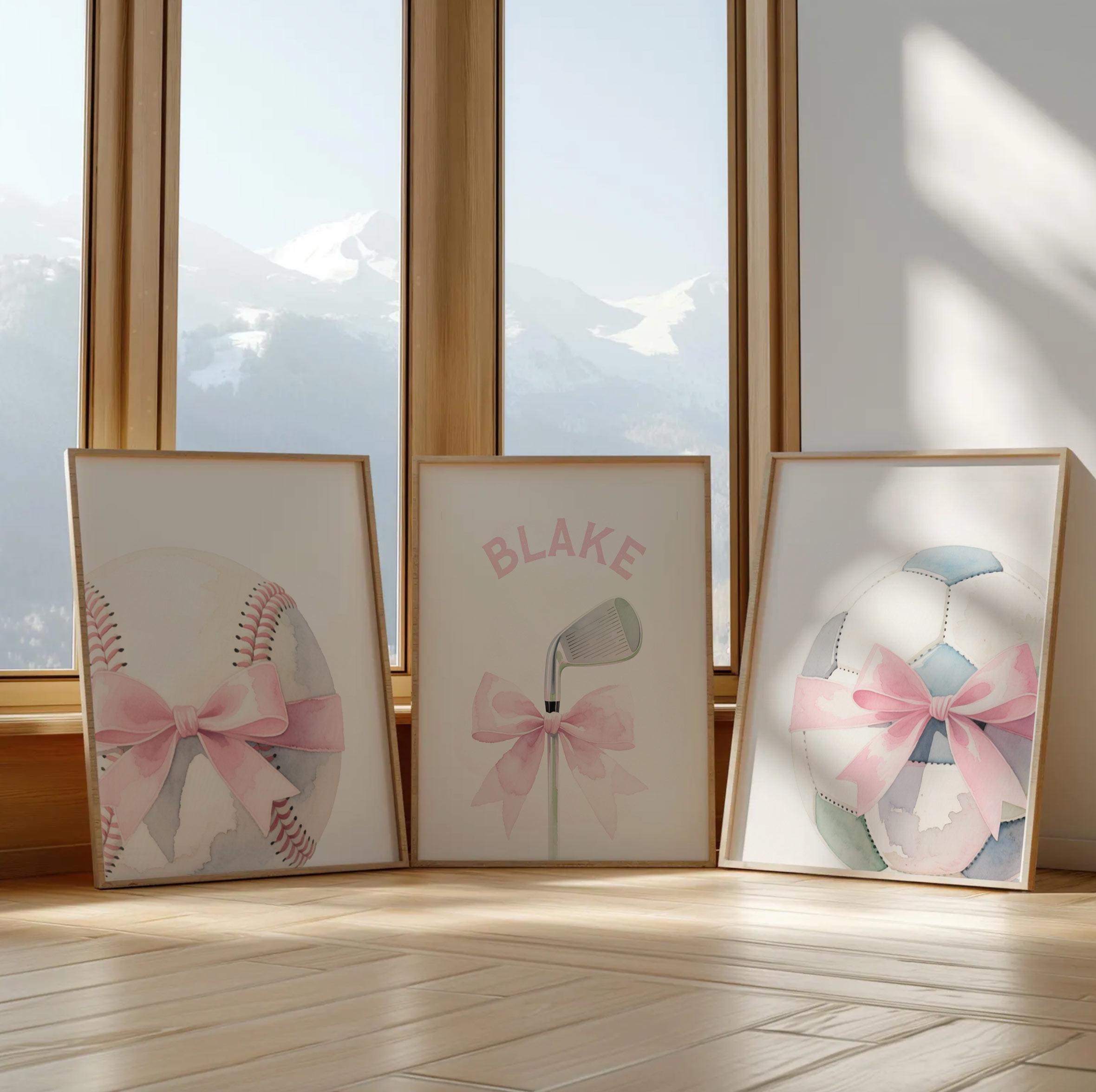Product description: Original sports theme watercolor prints in shades of pink and gray including a golf club, softball, and soccer ball, all accented with a bows with matching personalized print to be customized with your child's name. Other options are also available in my shop.