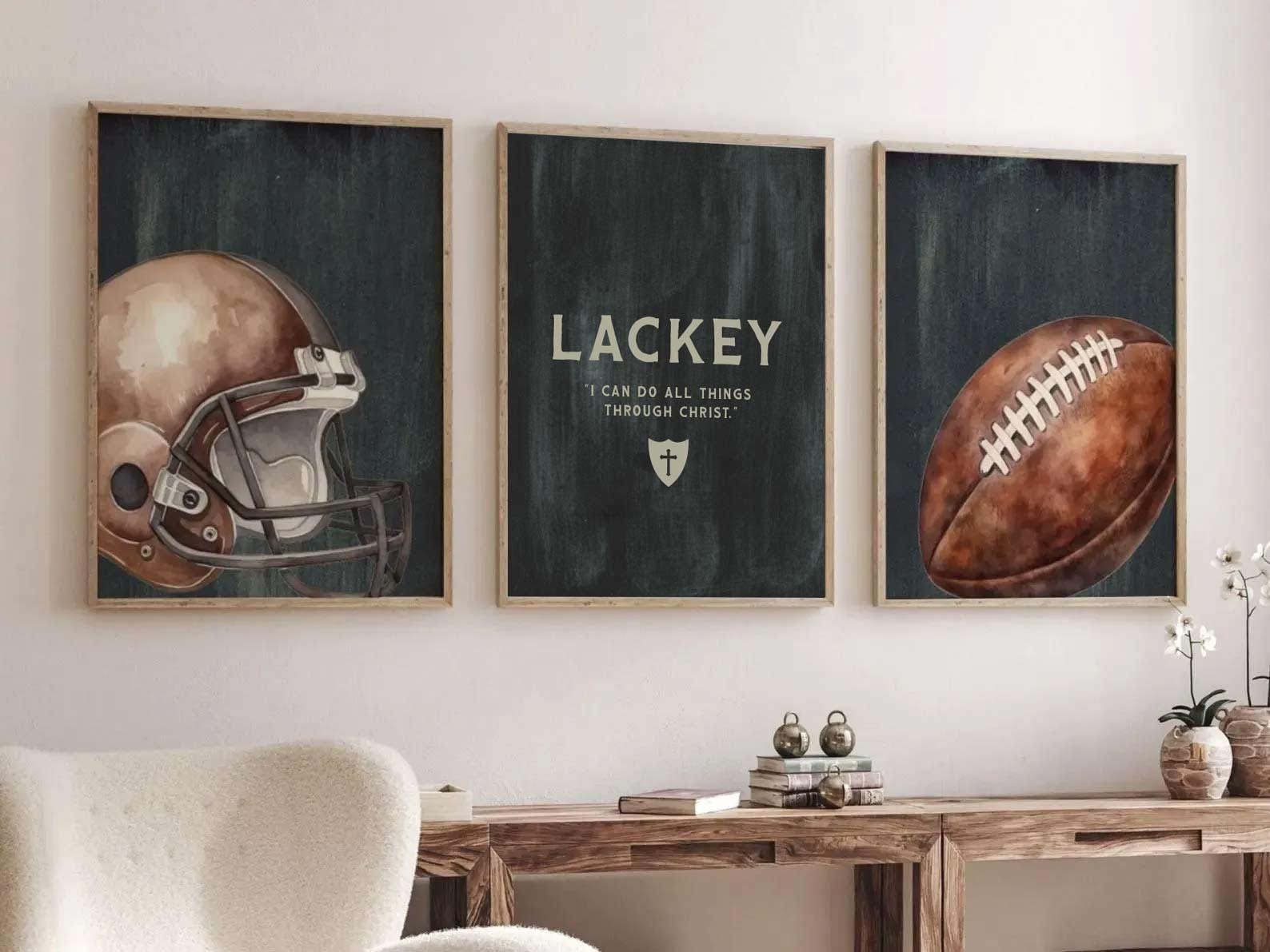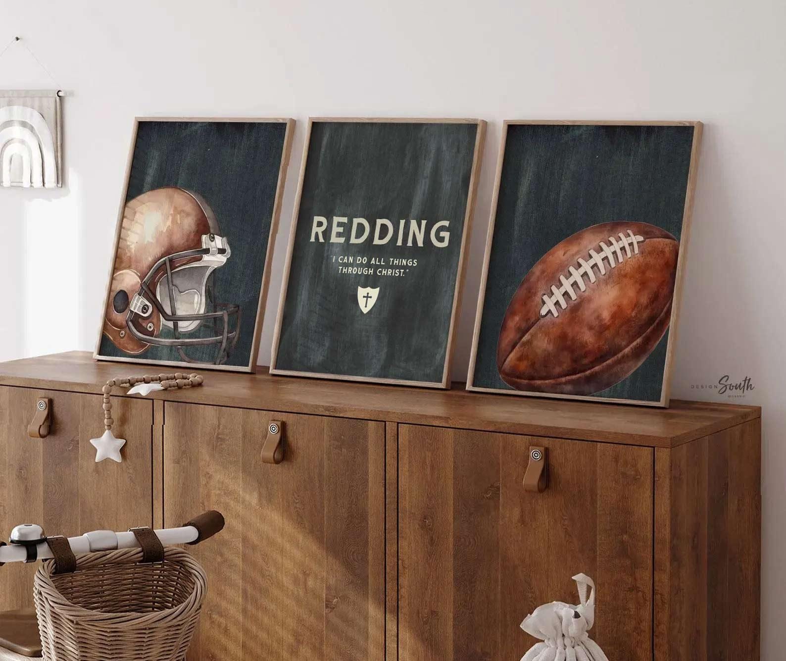 Product description: Football-themed watercolor prints featuring a football, helmet, Christian cross, the quote “I Can Do All Things Through Christ,” and a coordinating personalized print customized with your child’s name. Other options are also available in my shop.