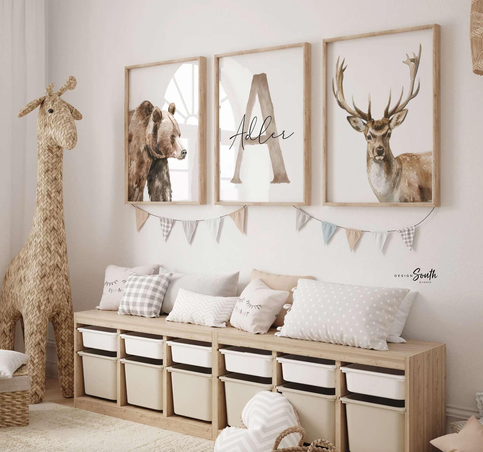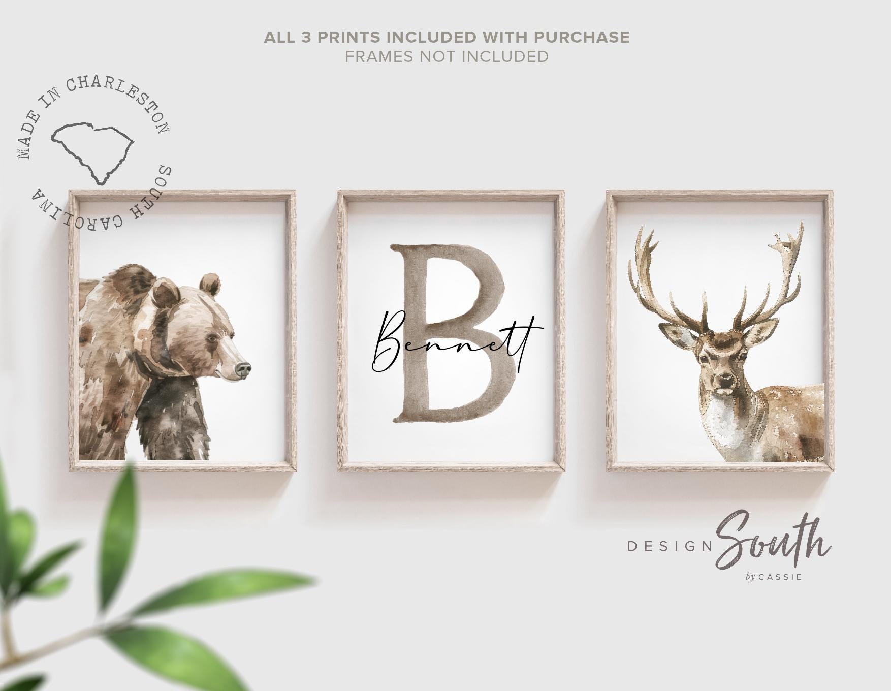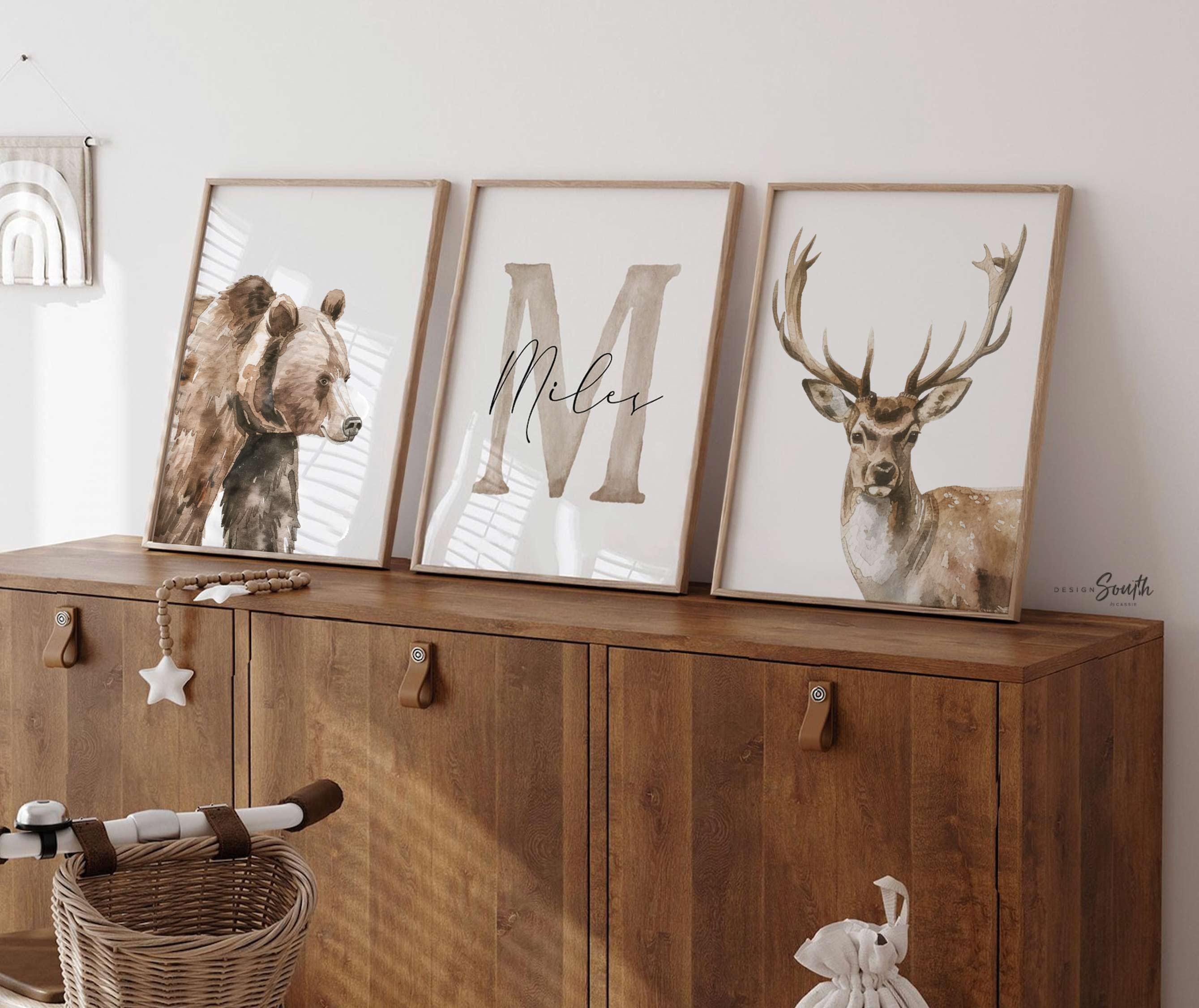 Product description: Watercolor buck deer and bear prints in neutral tones with matching print to be customized with your child's name. Other options are also available in my shop.