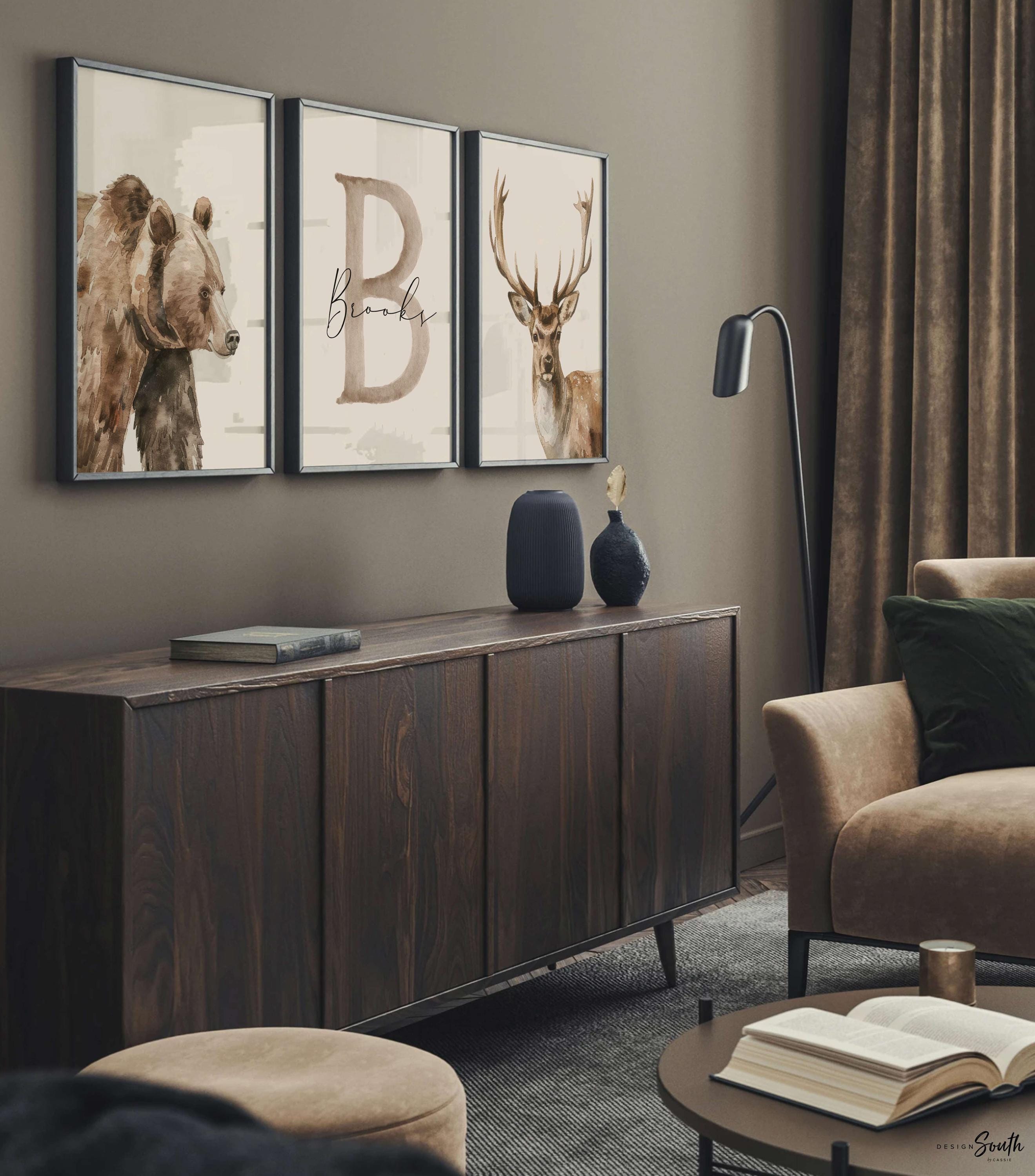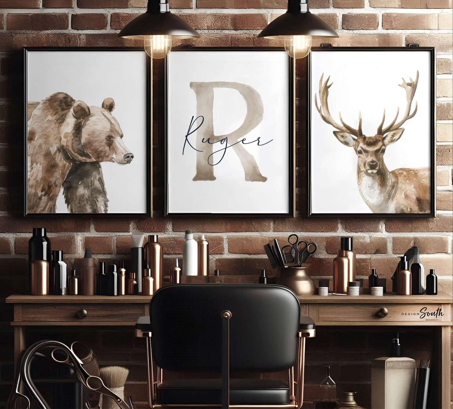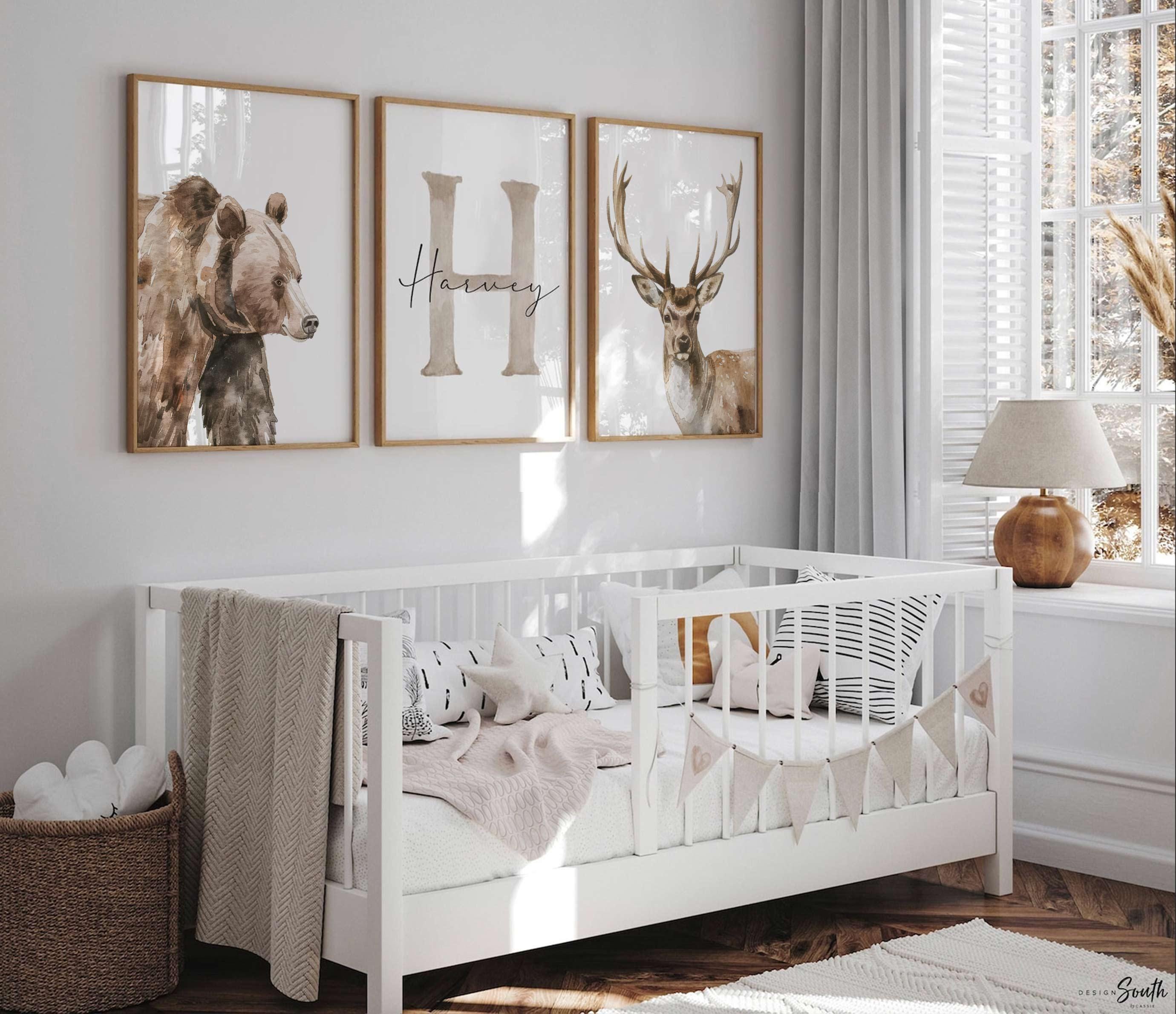 Product description: Watercolor buck deer and bear prints in neutral tones with matching print to be customized with your child's name. Other options are also available in my shop.