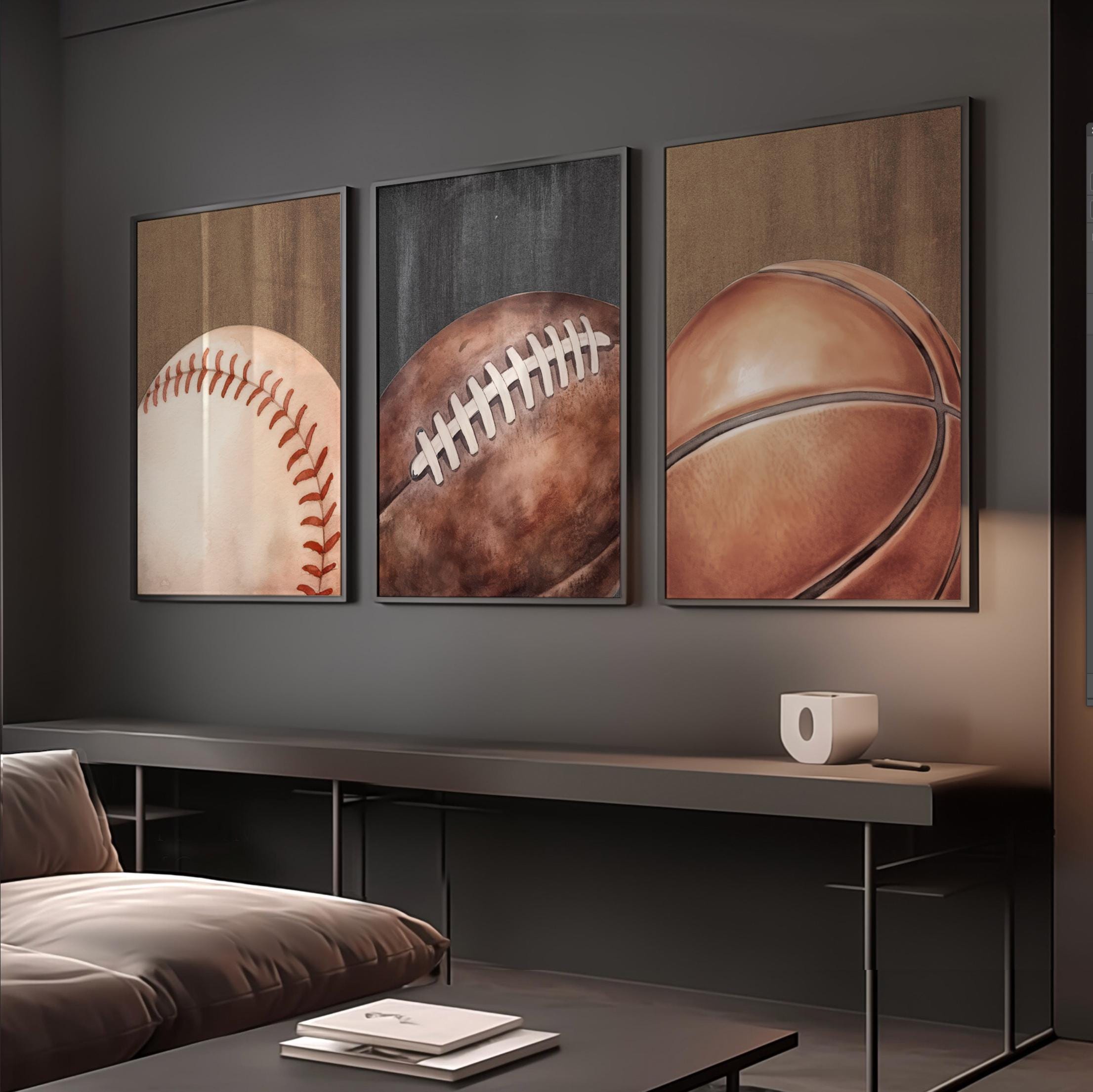 Product description: Sports theme watercolor prints including a basketball, football, and baseball with rustic textured backgrounds. Other options are also available in my shop.