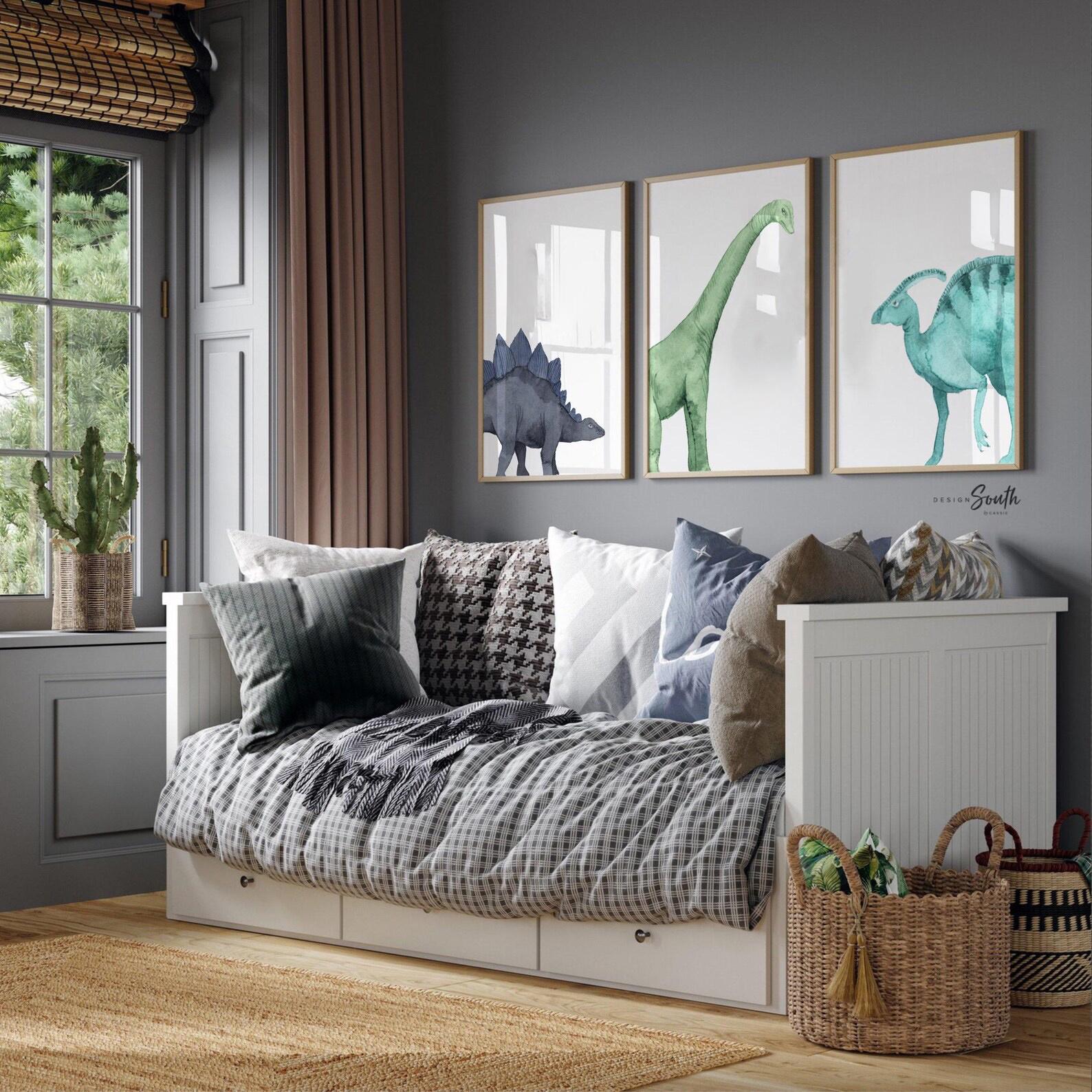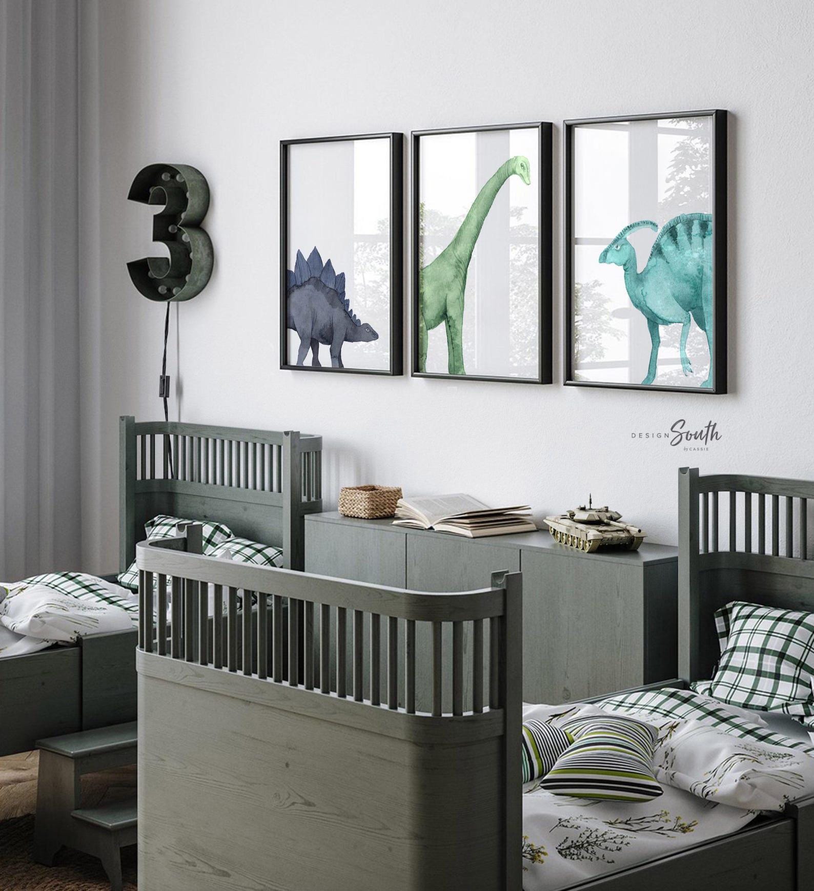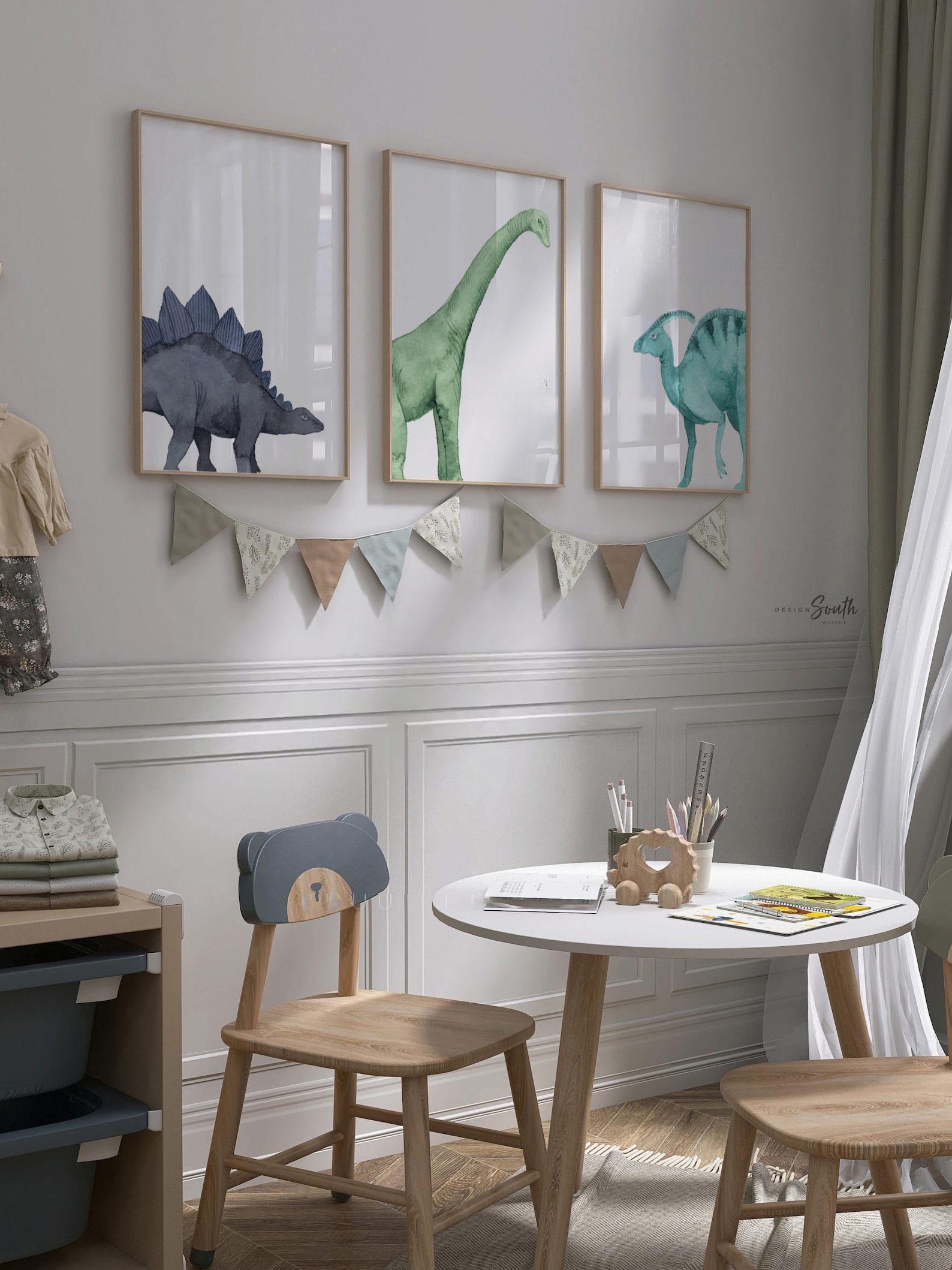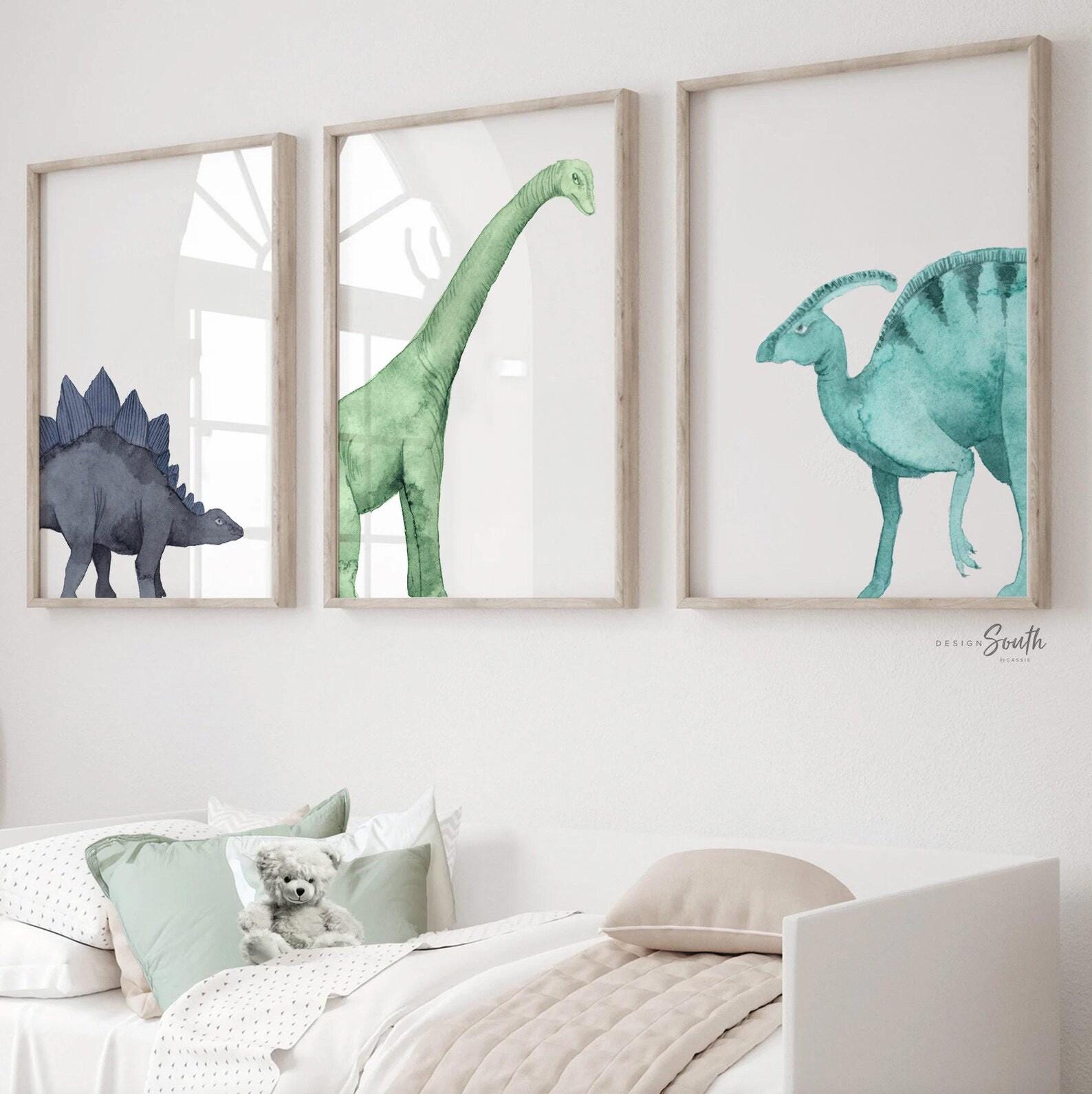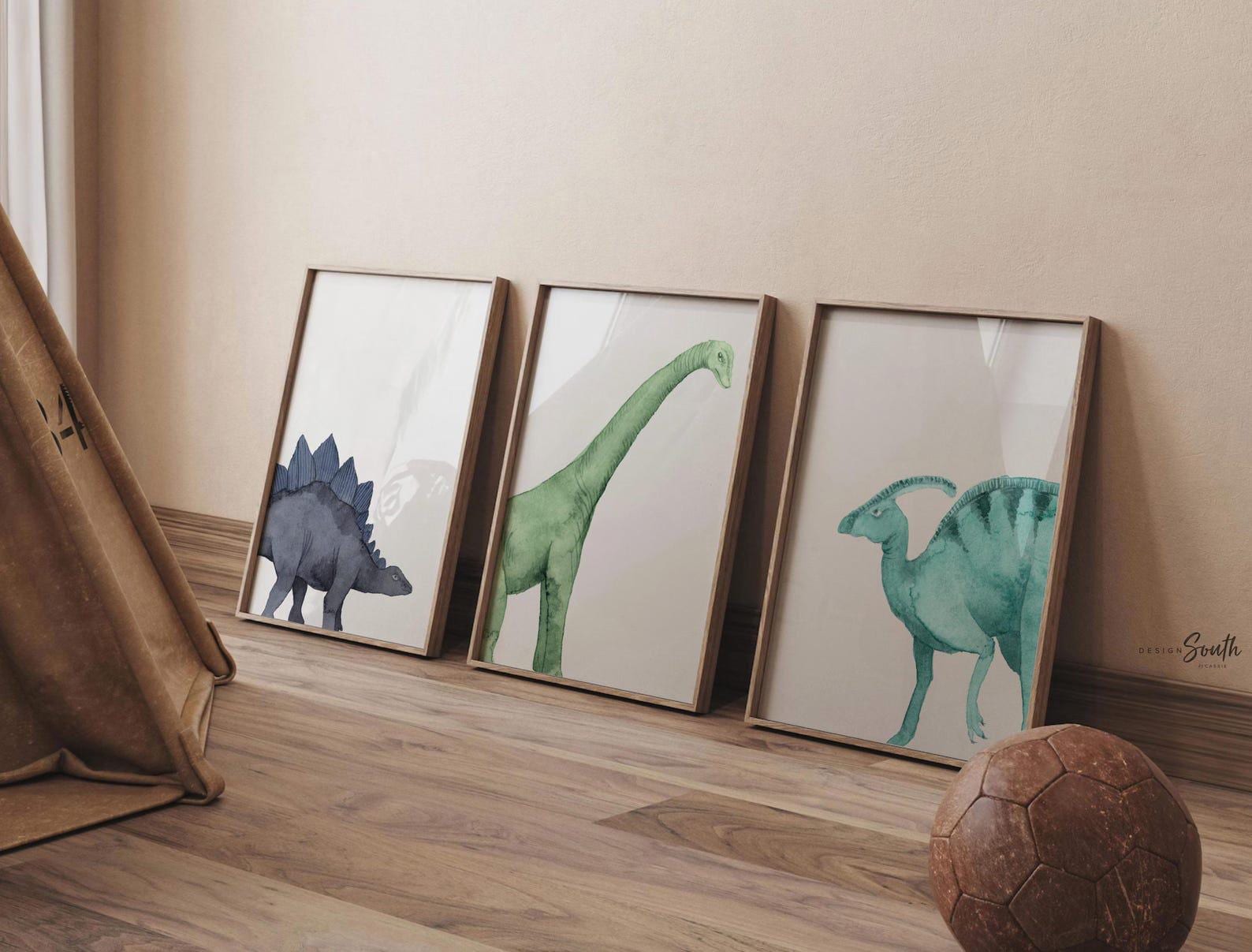 Product description: Watercolor dinosaur wall art set of 3 featuring a brachiosaurus, stegosaurus, and parasaurolophus in navy blue, green, and teal tones. This playful and colorful artwork set adds a whimsical, prehistoric touch to any child’s space and makes a great gift for dino-loving toddlers or new parents decorating a gender-neutral nursery. Other options are also available in my shop.