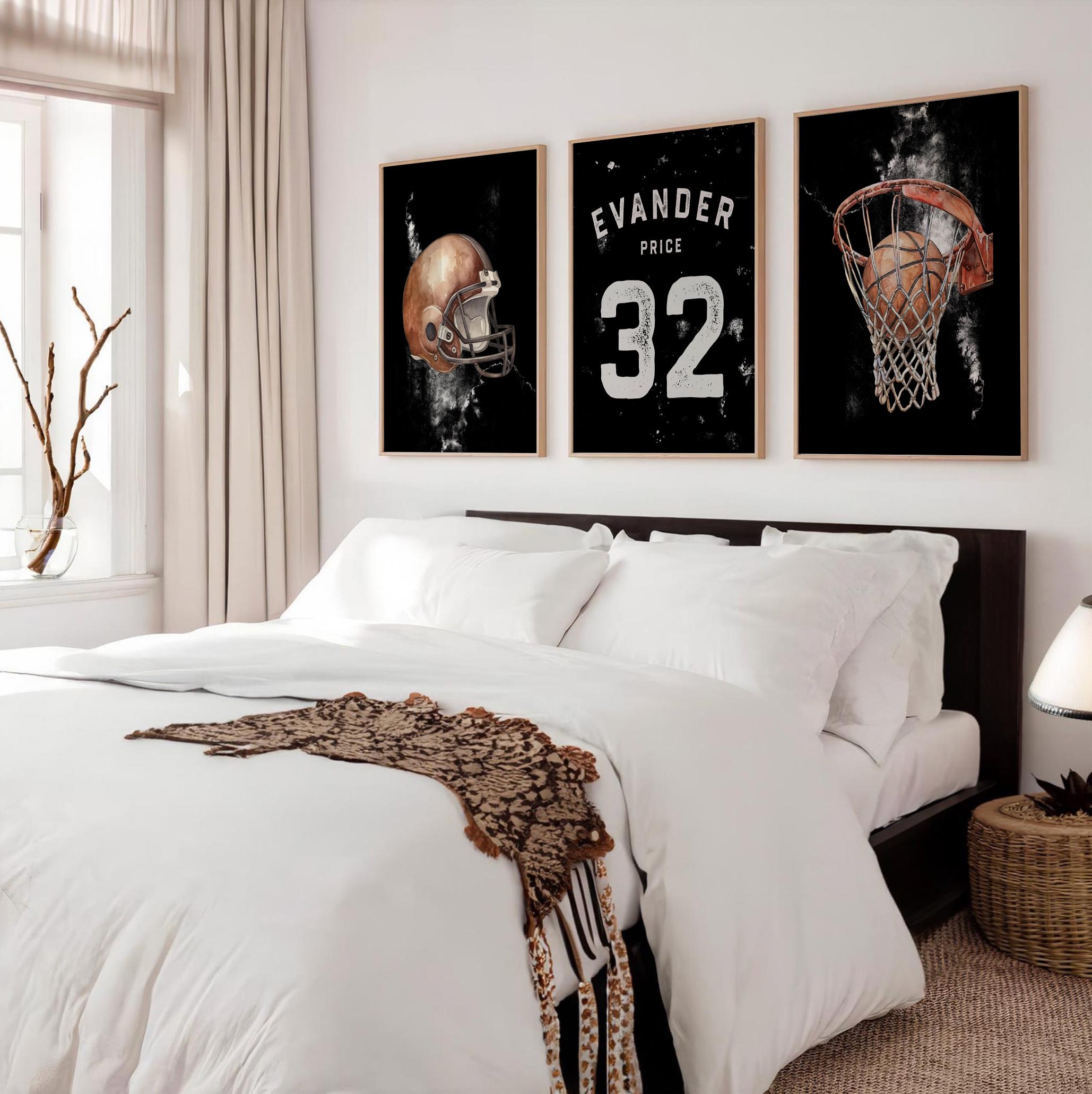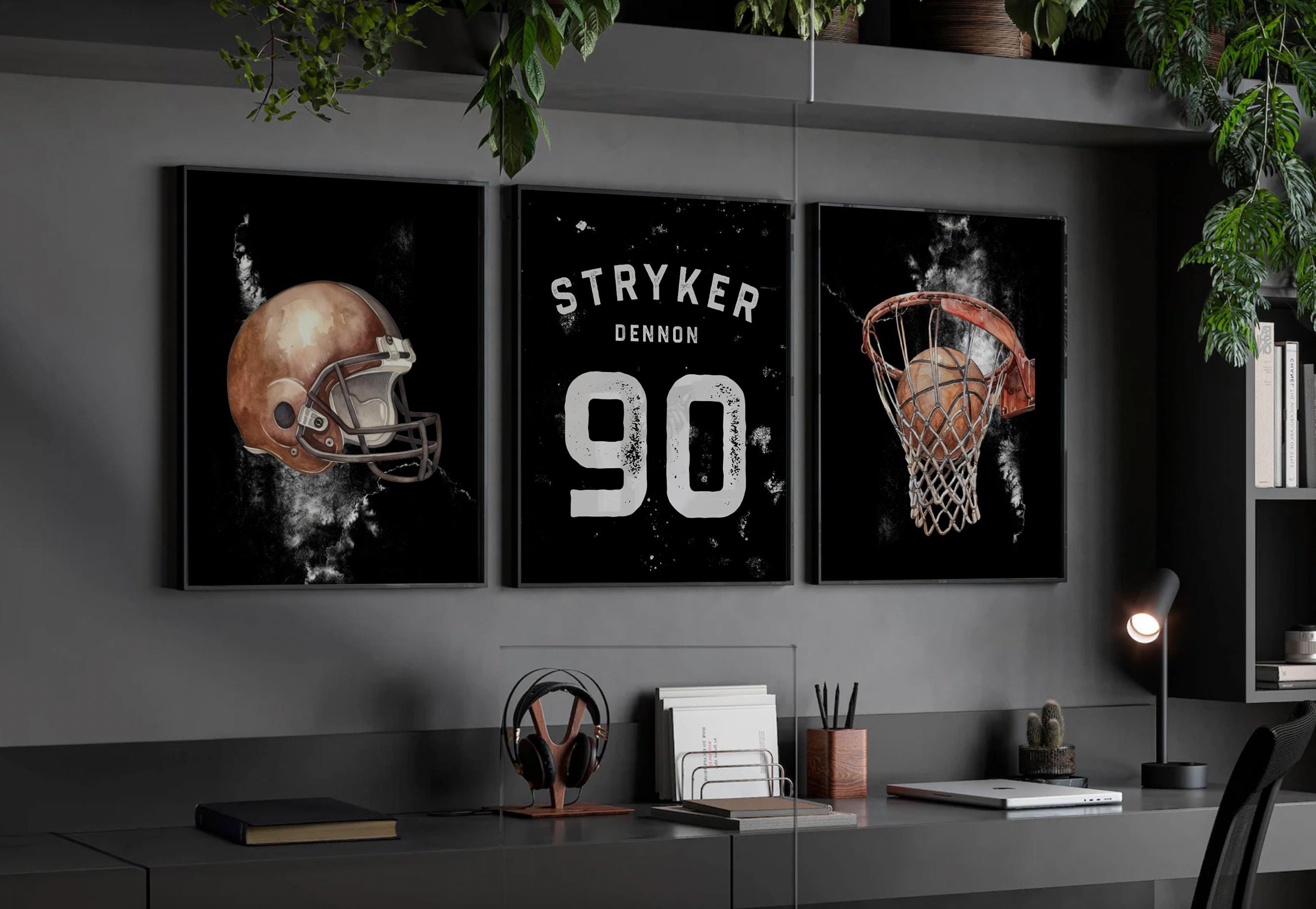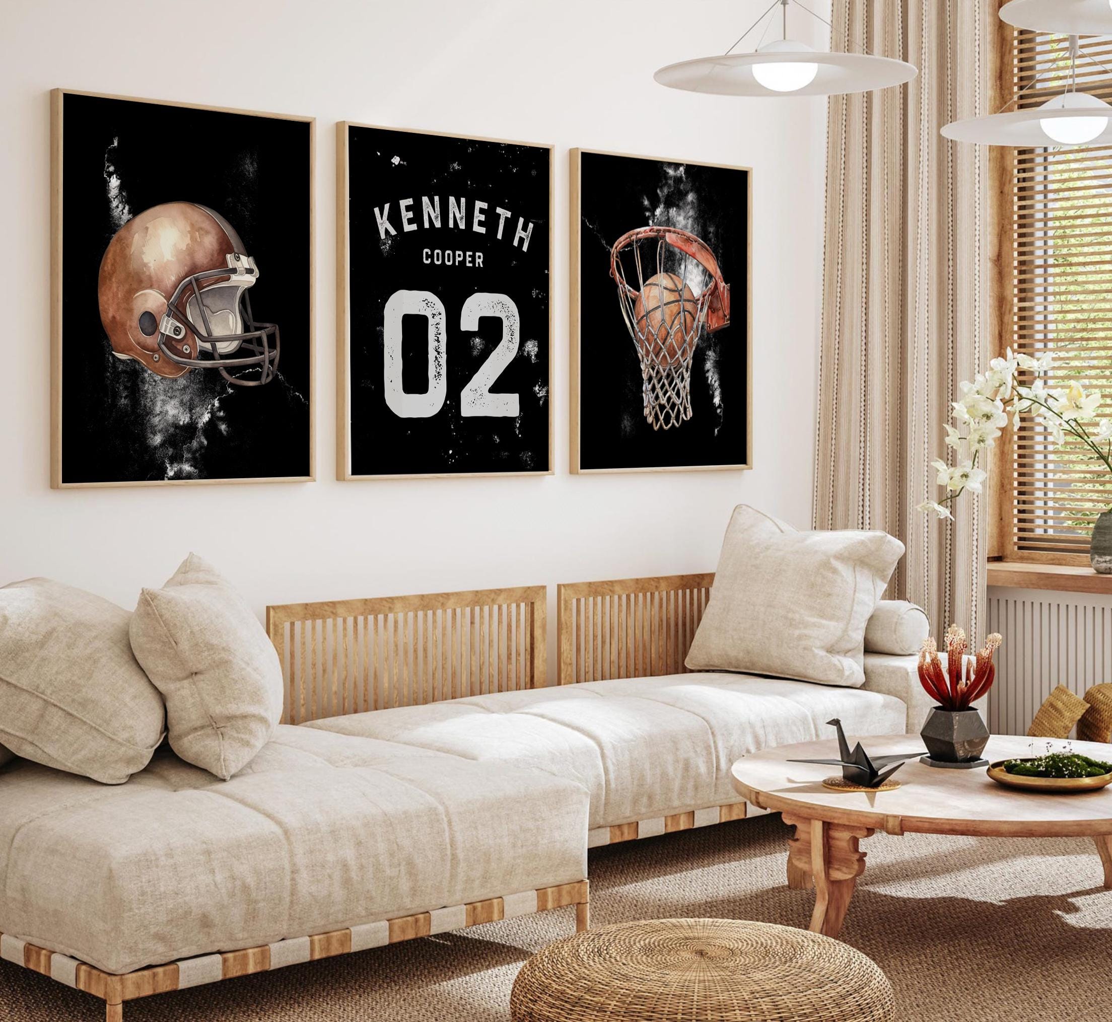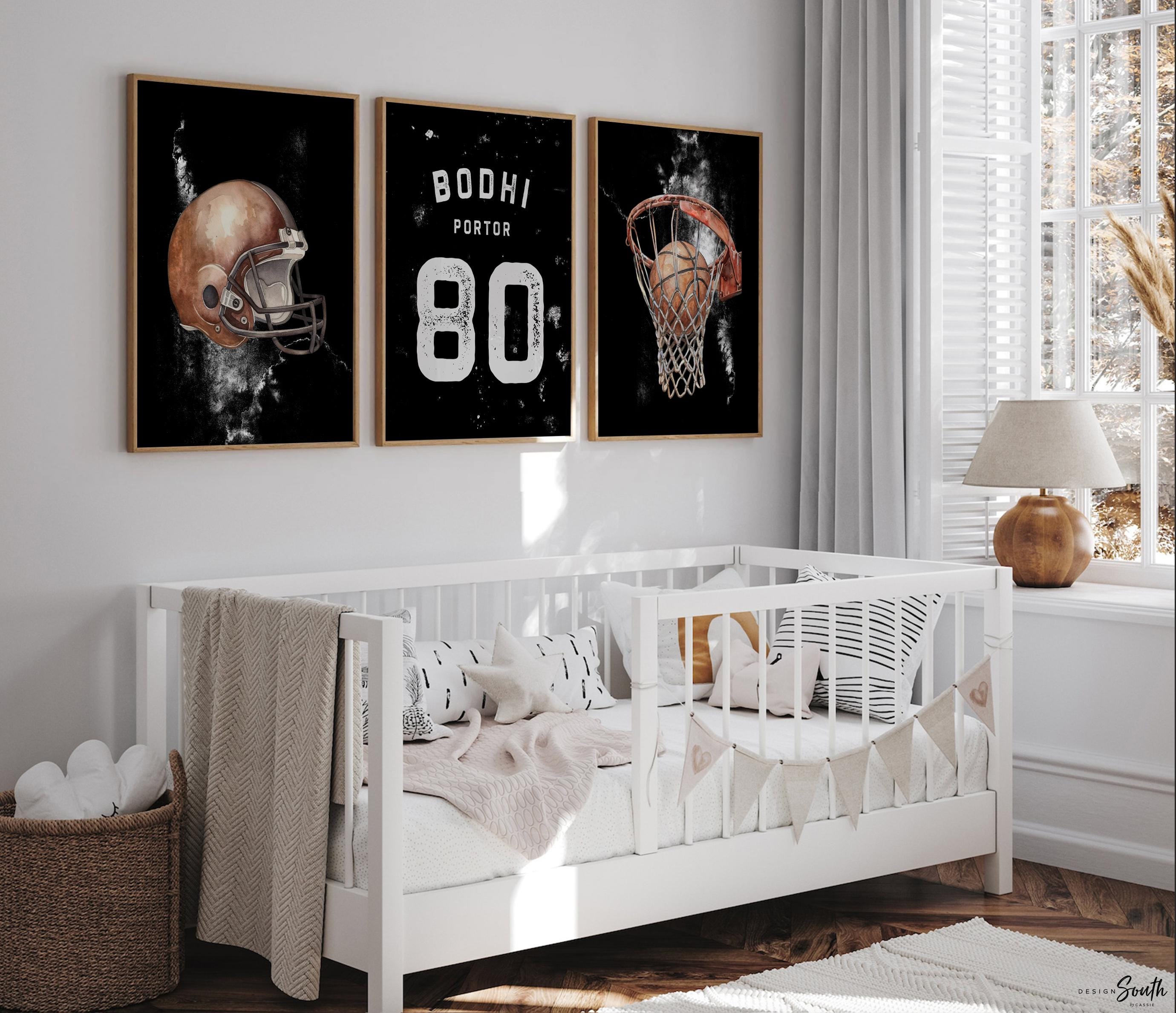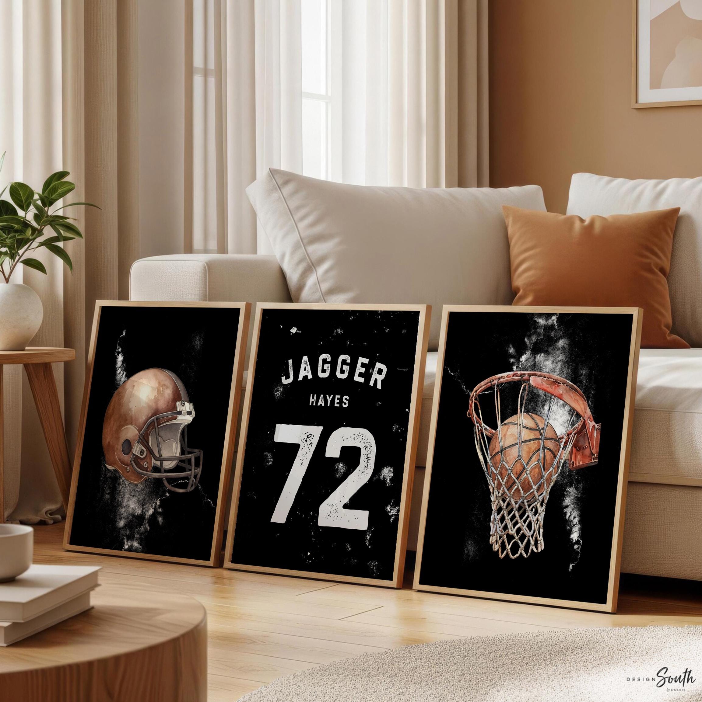 Product description: Sports theme watercolor prints including a football helmet and basketball in a basketball hoop with black and white ink distressed backgrounds and monogram print to be customized with your child's name and number. Other options are also available in my shop.